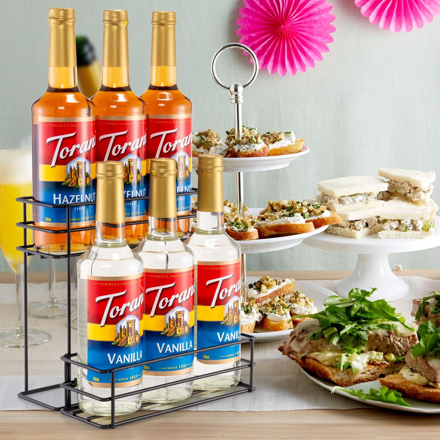 - ·【Coffee Bottle Stand】☕Do you have many flavored coffee syrups? Are you tired of rummaging through coffee bar cabinet for coffee syrup bottles? Our 6 bottles coffee syrup rack for coffee bar decor is the perfect solution for organizing and displaying your coffee syrups. .Its dimensions of 9.9''L x 7.3''W x 9.9''H and each tier approximately 3.7" wide.Features a stepped design to keep the items on the shelf at a glance and saves space.