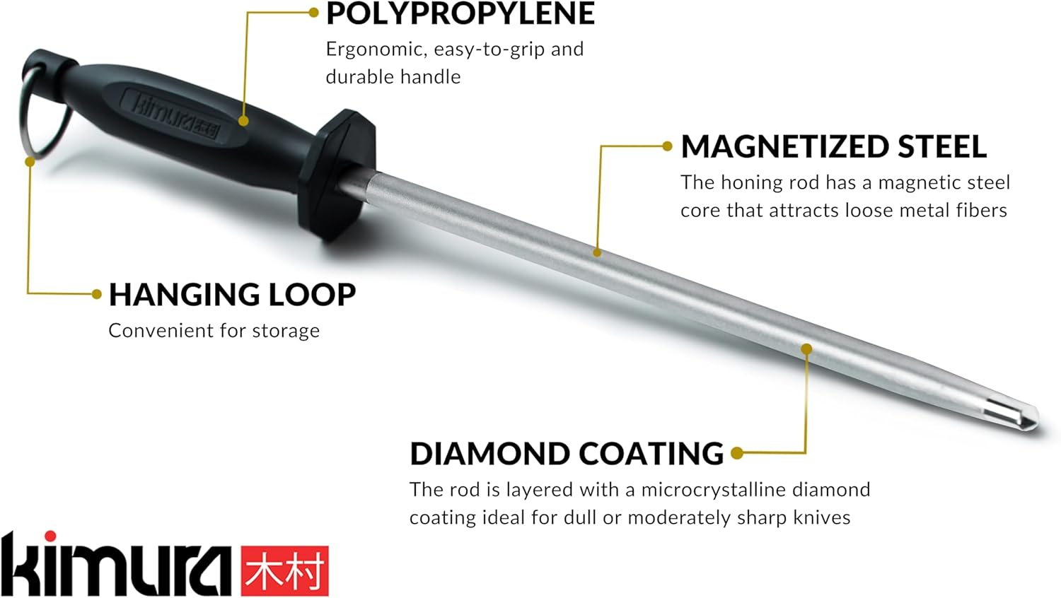 - [ PREMIUM MATERIALS ] - The 10 inch honing rod is made from microcrystalline diamond coated carbon steel that is enhanced and smoothened with Kimura’s proprietary diamond plating process. The honing steel is also magnetized for additional safety.