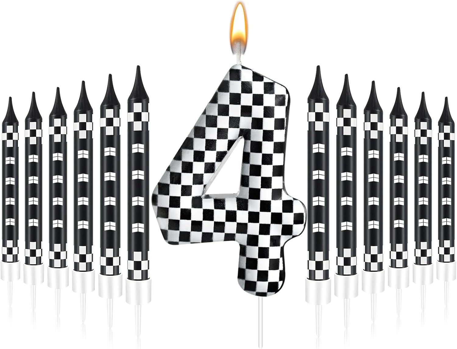 13 Pcs Racing Cars Themed Birthday Candles Black and White Race Number 4 Checkered Candle Cake Topper for Racing Car Party Decoration Supplies (Number 4)