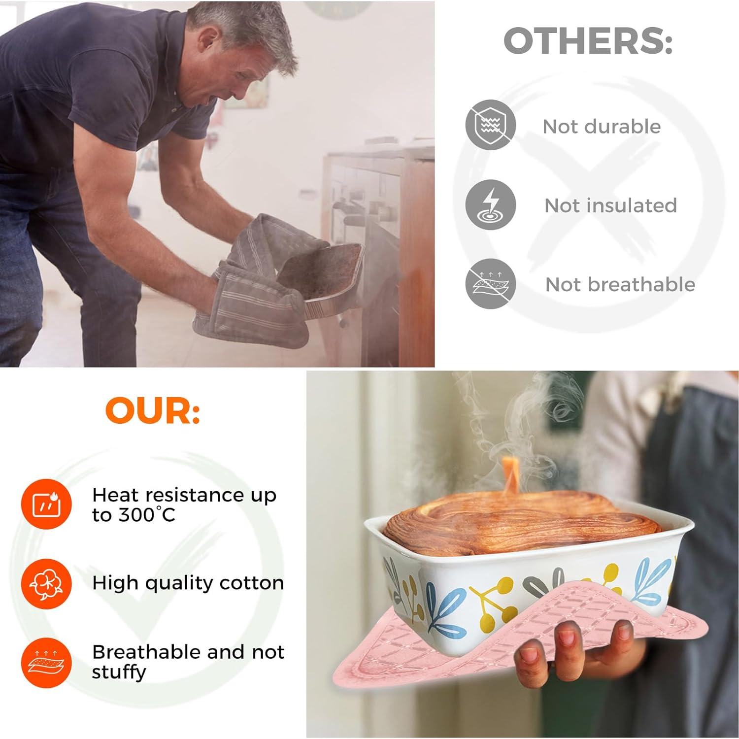 - 【Heat Resistant Up to 500 °F】Our high-quality oven mitts and pot holder set is heat-resistant up to 500 °F. Whether you're taking a casserole dish out of your oven, taking a pan out of your oven, or taking care of your hot grill, you can be sure that your hands are reliably protected from burns by our oven mitts.