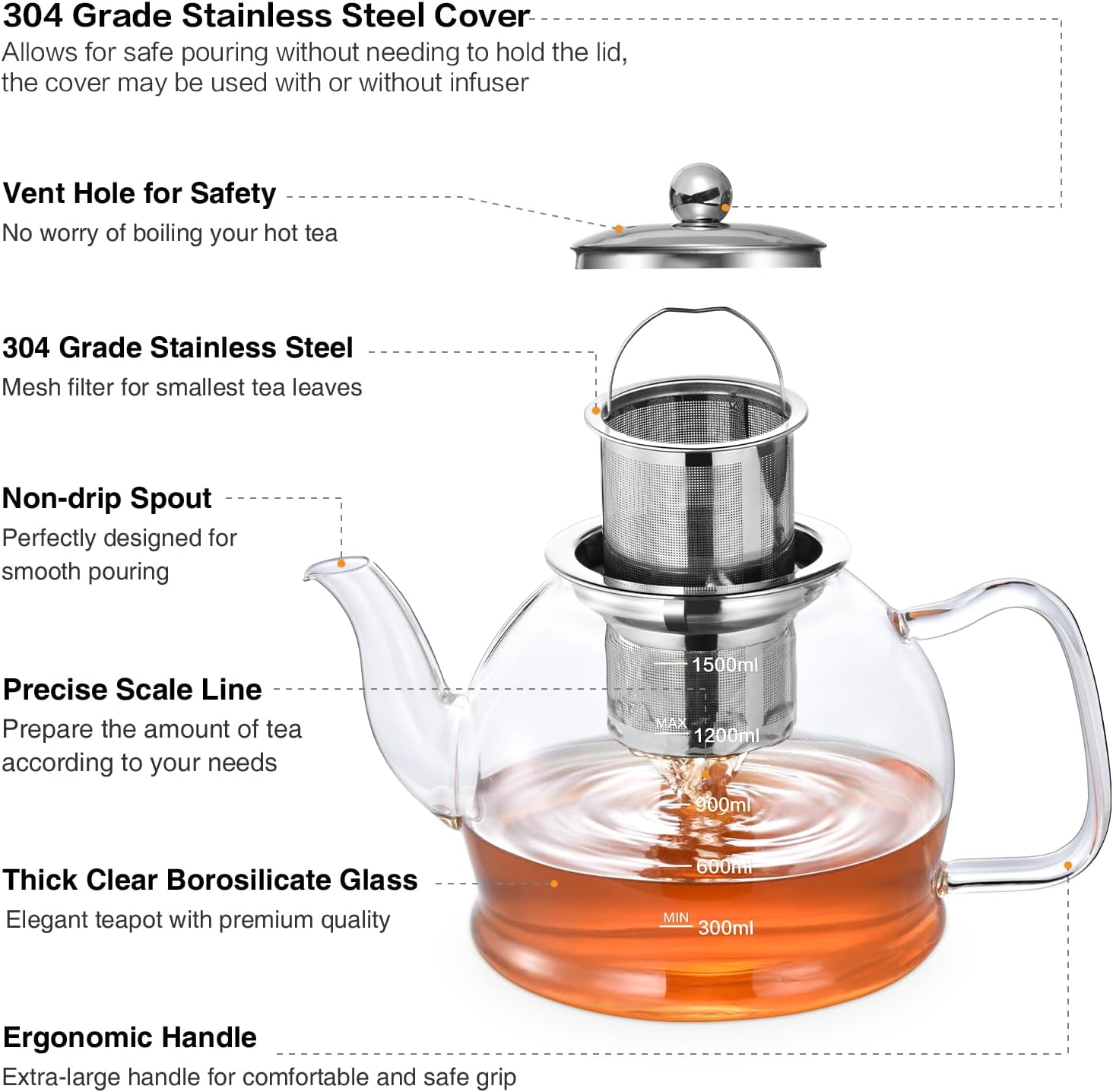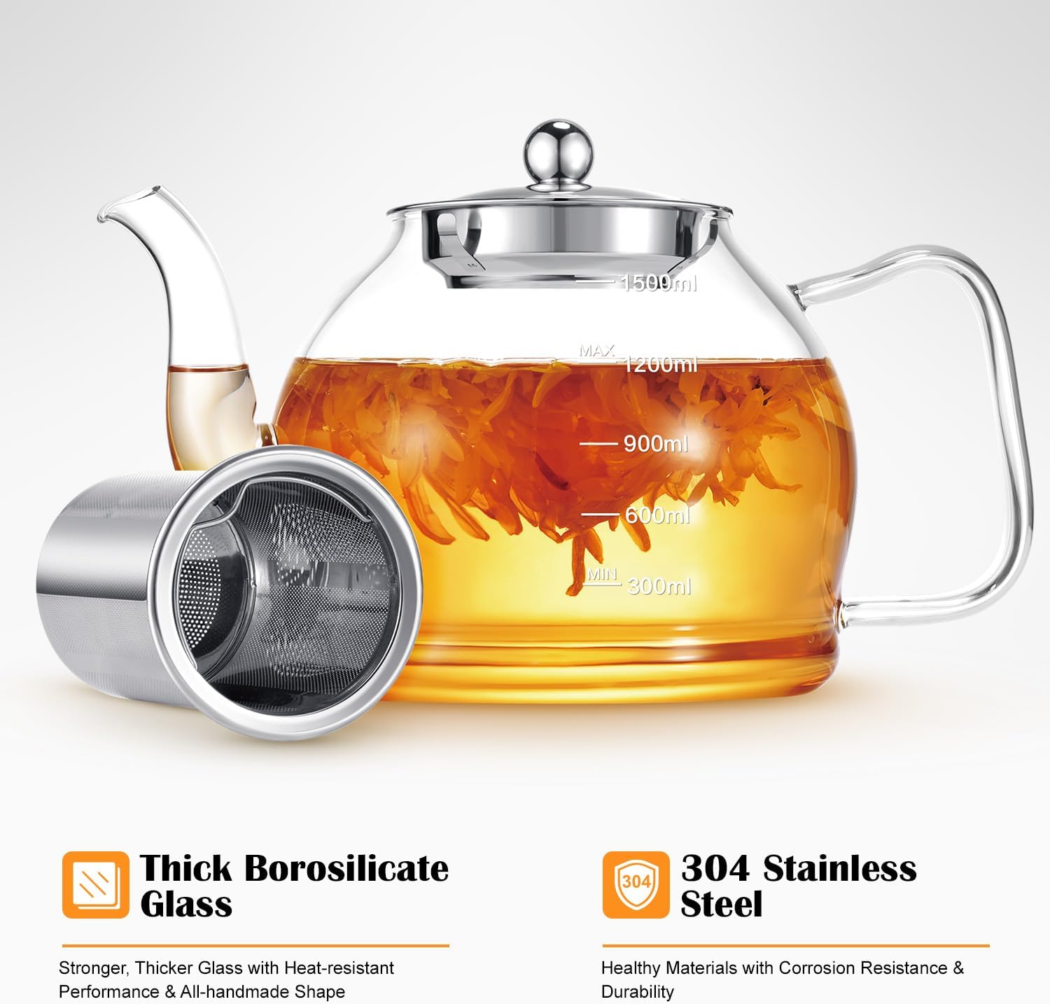 - ☕Humanized design:The 1500ml teapot has a large capacity and a water level scale is added on the surface. The teapot spout will not cause water splashing. The widened and thickened handle is more user-friendly and safe. The fine stainless steel mesh immersion filter filters all the tea. , The taste is great