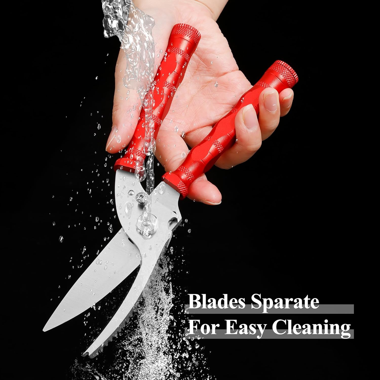 - 【Premium quality ultra-sharp Poultry shears】The high-quality kitchen poultry shears forged from premium stainless steel are sharper and thicker. Kitchen scissors are a professional heavy-duty kitchen scissors with a quick and easy detachable structure where one blade can be turned into a knife. The detachable blade also makes cleaning easier and does not leave a stain on the scissors.