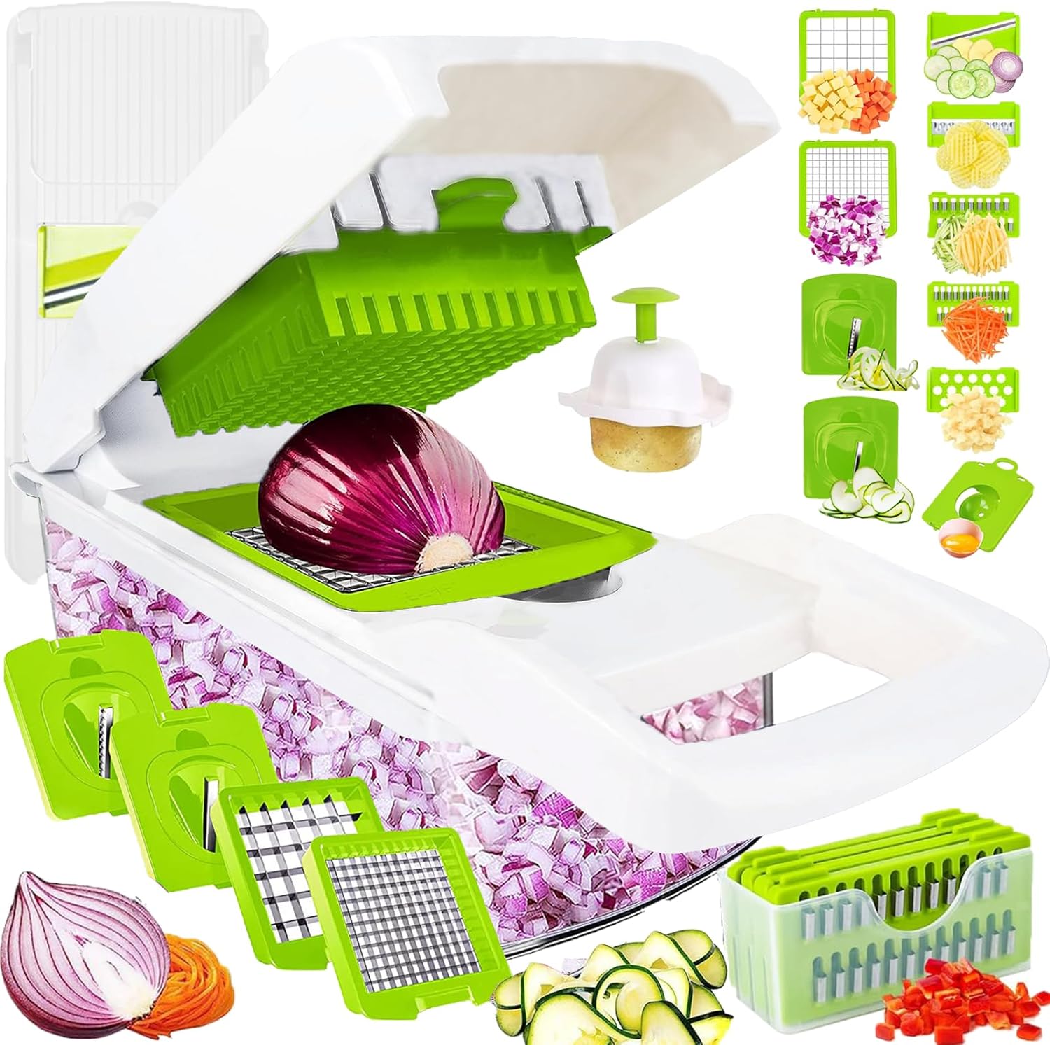 - Meet Various Needs - Contains 2 different sized chopper blades, 5 interchangeable blades and 2 spiralzer blades, offer the functionality of multiple kitchen tools in just one, highly versatile, kitchen gadget, meet all your slicing, shredding, grating needs. There is an egg white separator include,to easily separate egg whites from yolks. Can cut most types of vegetables and fruits as potato, tomato, cucumber, carrot and cheese. Can make WAFFLE FRIES OR RUFFLED POTATO CHIPS.