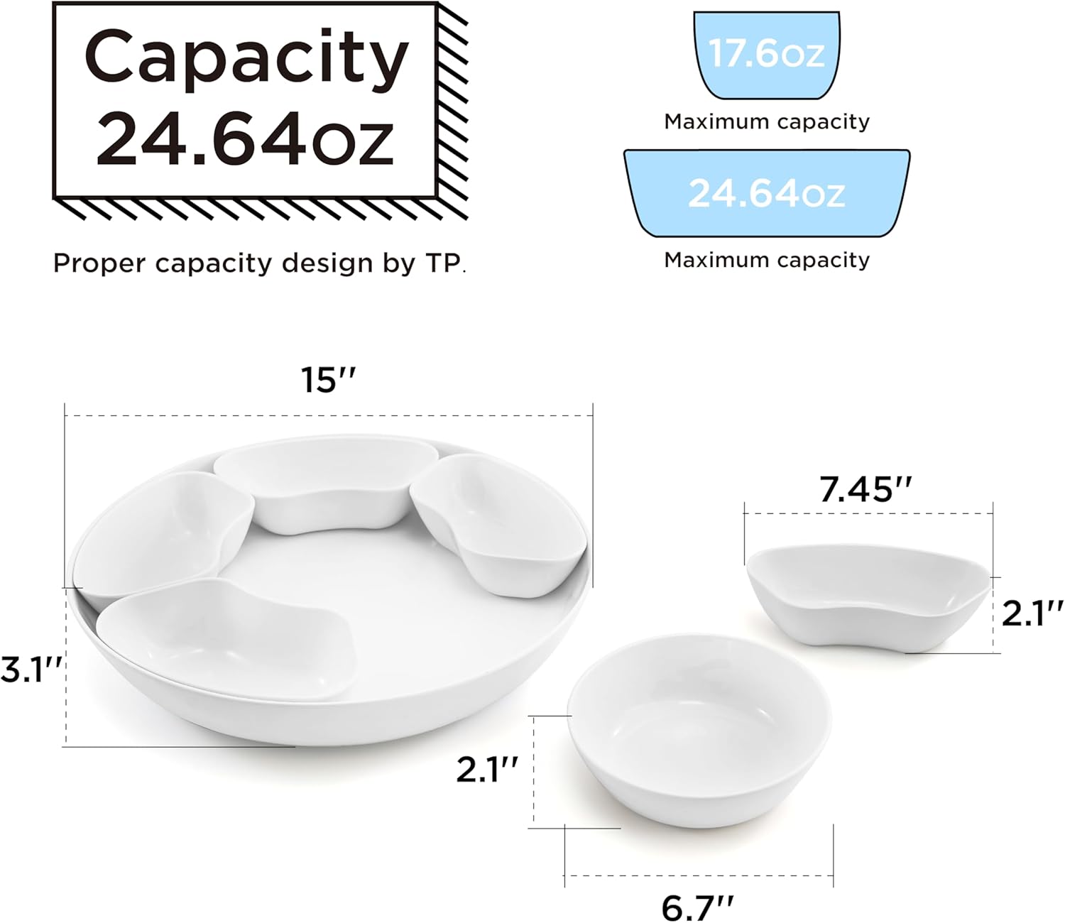 - Taco Serving Platter Details: Experience the ultimate convenience with our 15" 360° rotating platter, which includes five 7.45" ingredient trays and a 6.7" dipping bowl. Together, they offer a maximum capacity of 24.64 ounces, making it perfect for all your serving needs. NOTE: NOT MICROWAVABLE