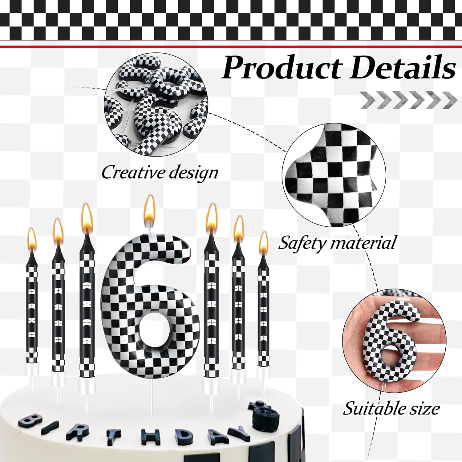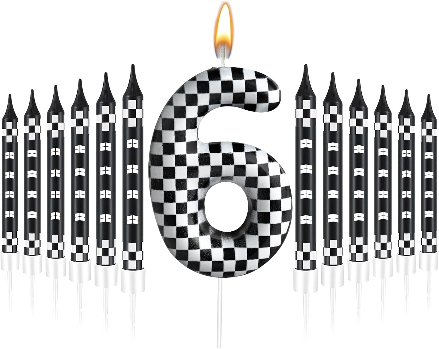 - The Package Includes: You will receive 12 black and white track car themed birthday candles and 1 number 6 black and white checkered candle, Sufficient quantity for birthday cake decoration or party celebration and daily use, note: the candle will slowly melt as it burns, and it is recommended not to leave it on the cake for more than two minutes