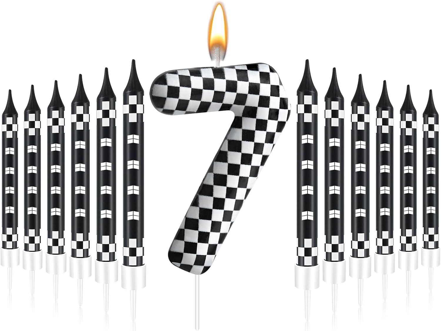 13 Pcs Racing Cars Themed Birthday Candles Black and White Race Number 7 Checkered Candle Cake Topper for Racing Car Party Decoration Supplies (Number 7)