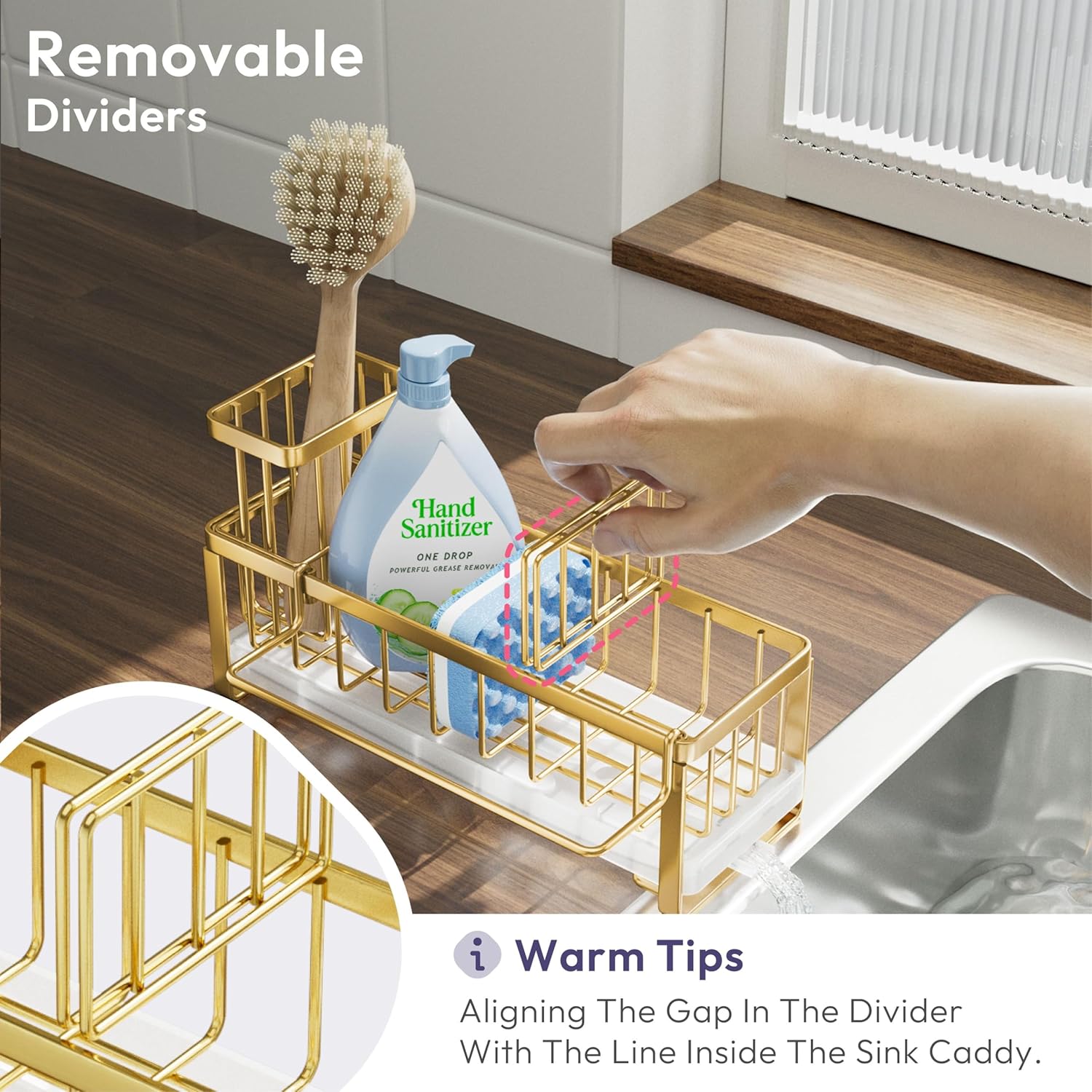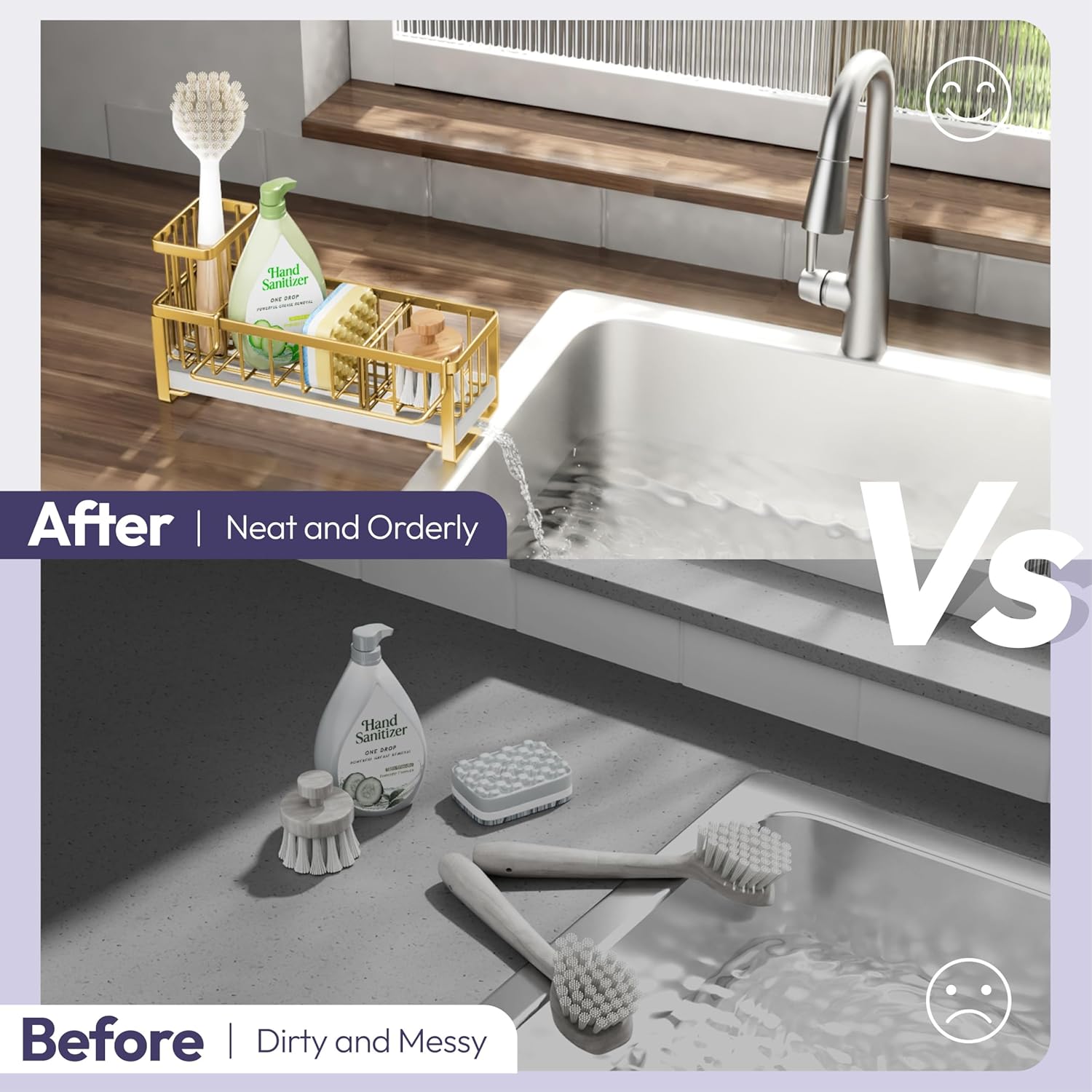 - [Unique Divided Space Sponge Caddy]: The removable baffle design divides the sink caddy into 2 separate storage spaces, you can disassemble at any time according to your need, it's perfect for storing dish soap bottles, sponges, sink stoppers,etc