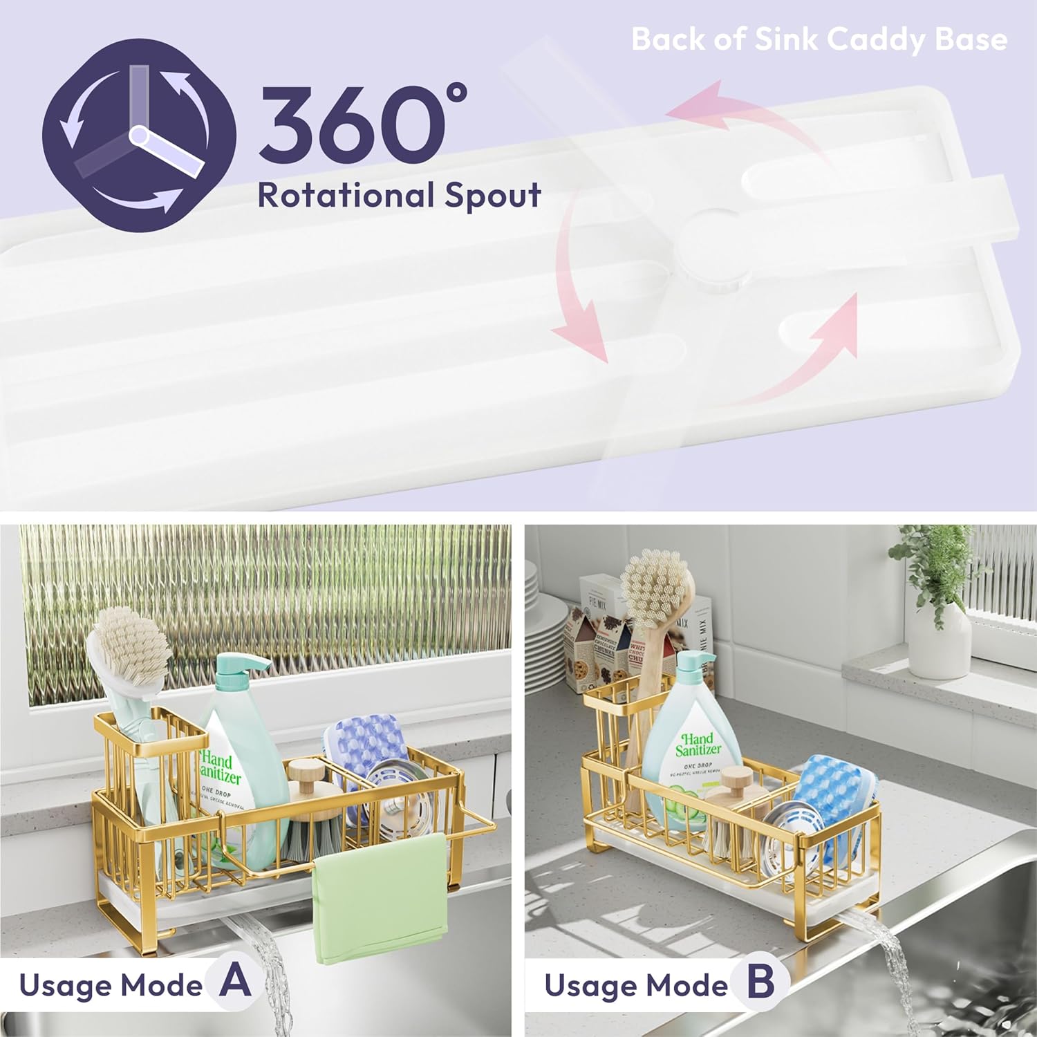 - [Automatic Draining]: Are you tired of cleaning the countertop?SWTYMIKI sponge holder for kitchen sink with 360° rotatable draining pipe can help you! Just put the sink caddy next to the sink, the water will drain automatically into the sink