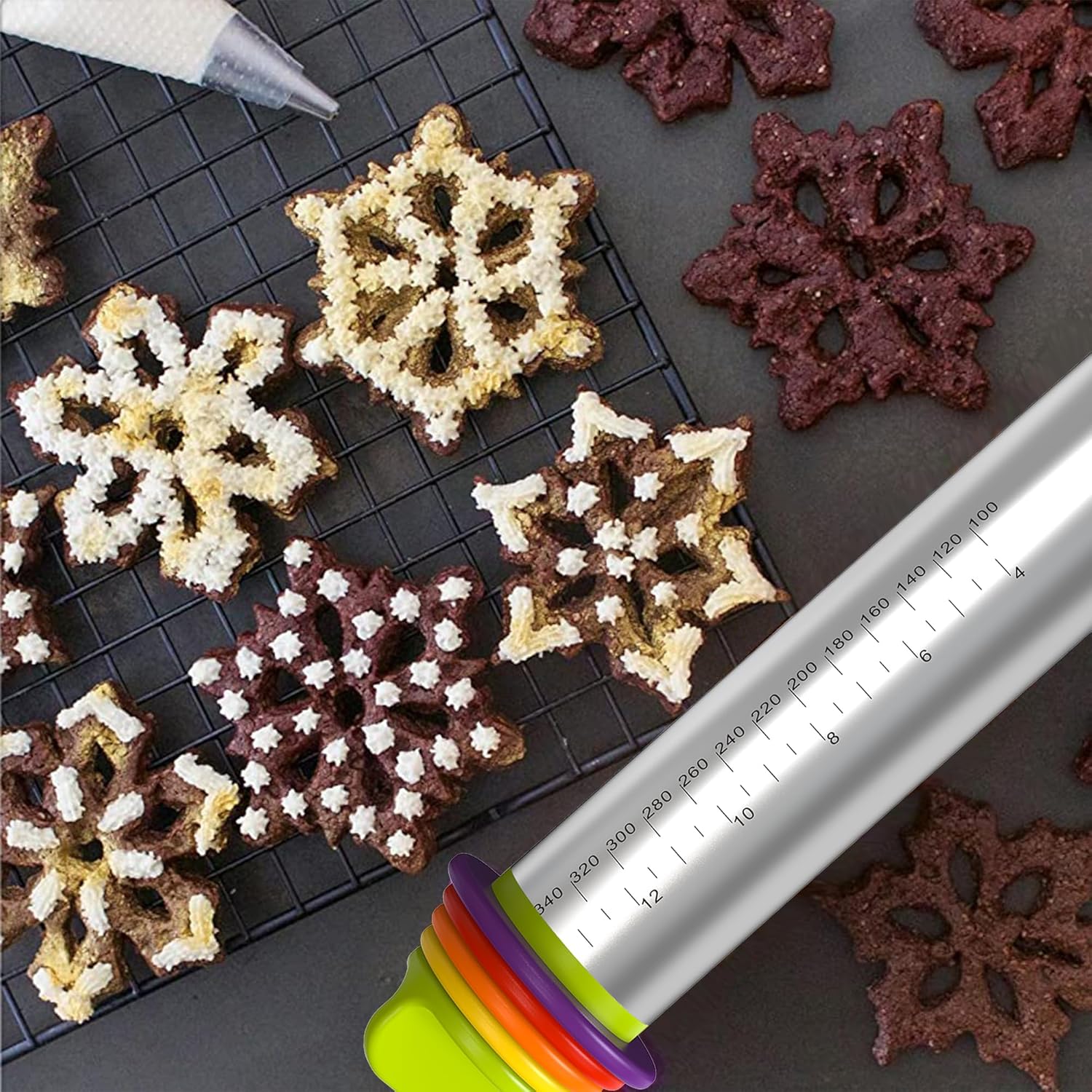 - 🍕【SMOOTH ROLLING PINS FOR BAKING】The dough roller pin is made of food-grade stainless steel structure, engraved in inch and centimeter dimensions, and different thickness ring devices can be attached/removed at both ends.
