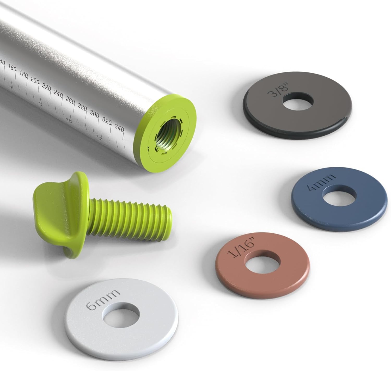 - đ„Żă4 THICKNESS RINGS AND WOODEN STANDă Featuring rings with different diameters of 1/16" (2 mm), 1/6" (4 mm), 1/4" (6 mm), and 3/8" (10 mm) allow the rolling pin to be substituted for different dough heights, and can accommodate your ideal dough thickness; The wooden stand fits the rolling pin and prevents it from being damaged by unintentional rolling.