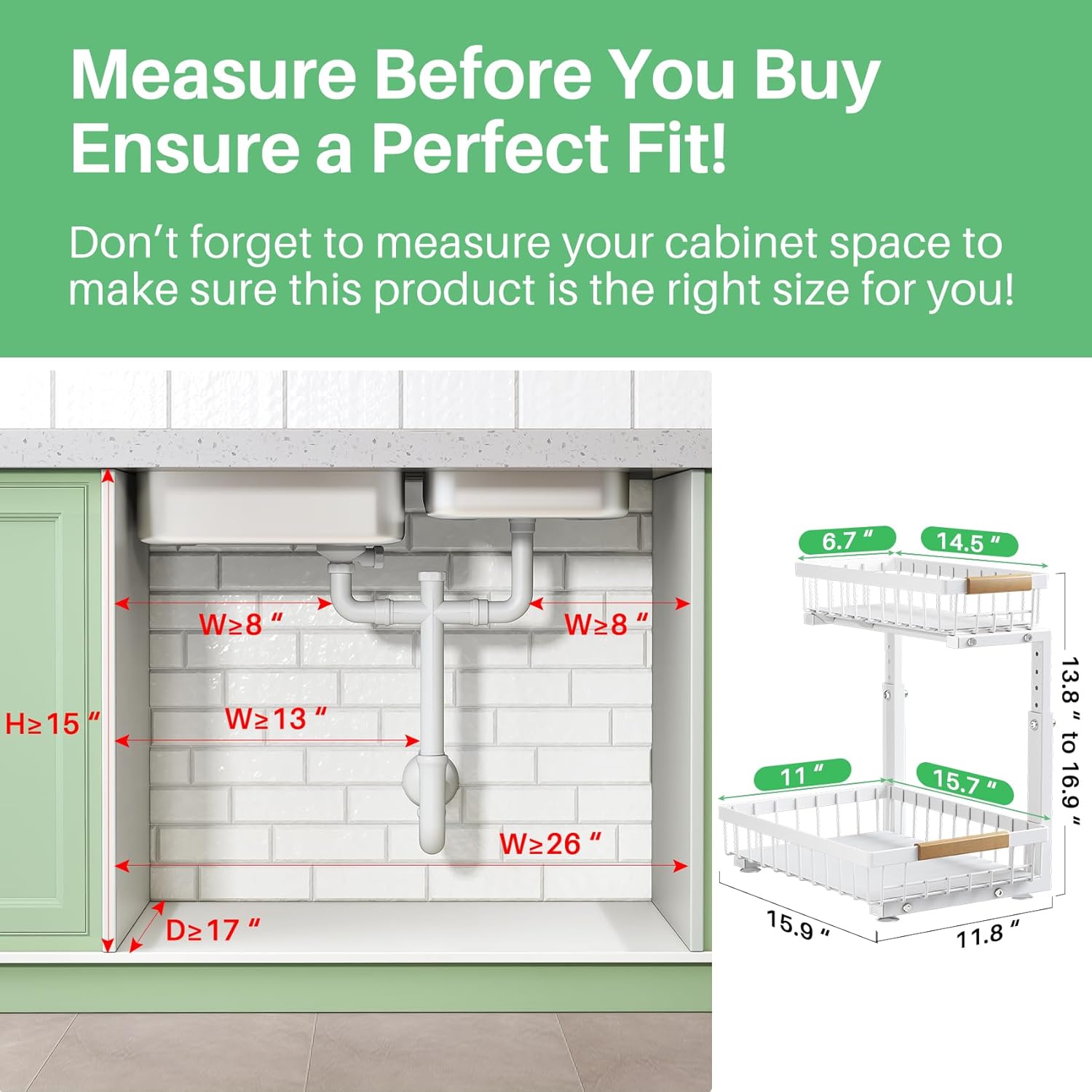 - Larger Organizer for Maximum Efficiency: This under sink organizer, measuring 11.8"W x 15.9"D x (13.8"-16.9")H, providing more capacity for storing taller bottles, cleaning supplies and other essentials.Before purchasing, please double-check your cabinet dimensions to ensure this under cabinet organizer fits properly.