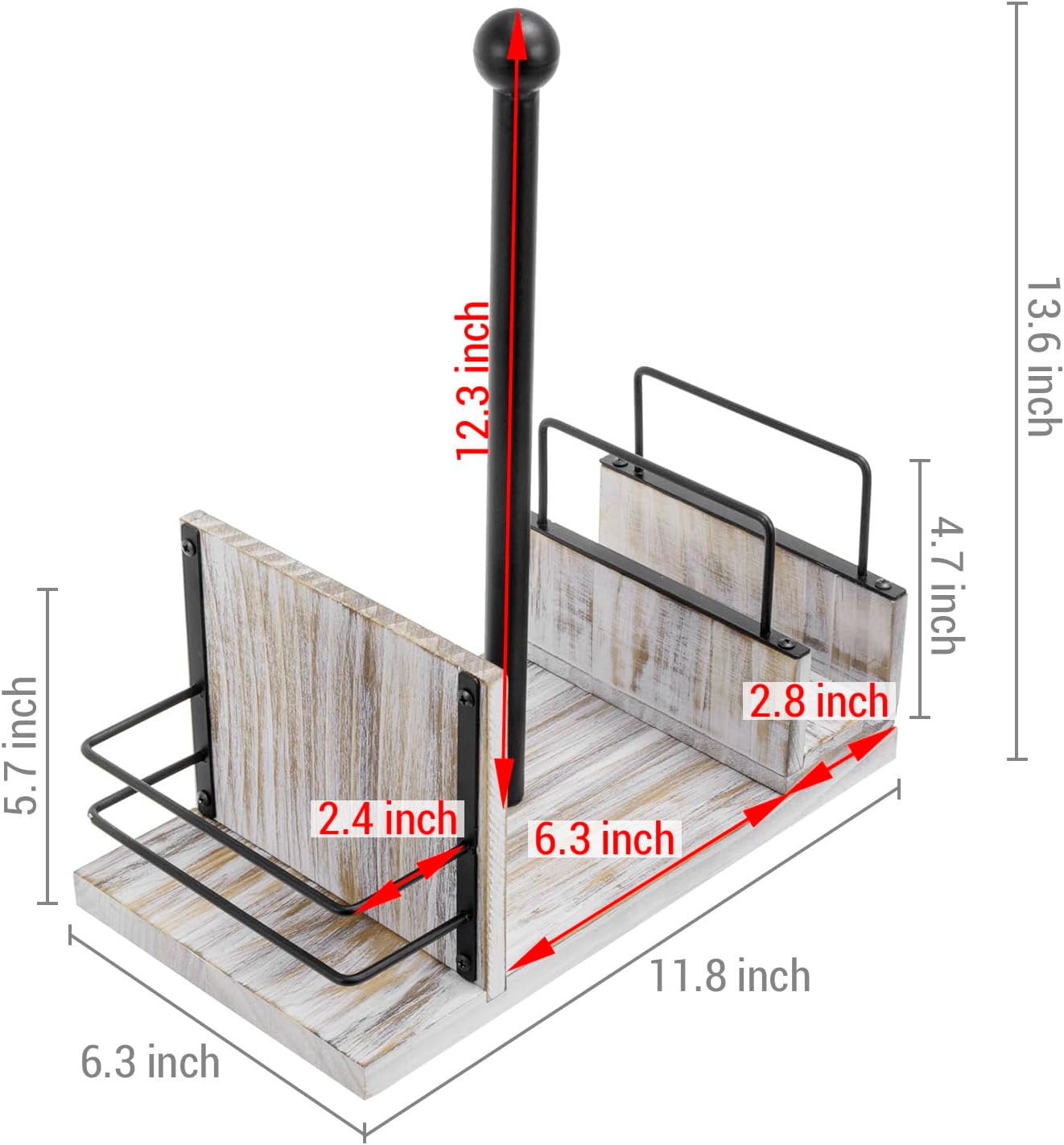 MyGift All-in-One Paper Towel Holder Kitchen Caddy, Shabby Chic Whitewashed Solid Wood and Industrial Matte Black Metal Dining Combo Rack with Paper Towel Dispenser, Napkin Holder, and Spice Rack