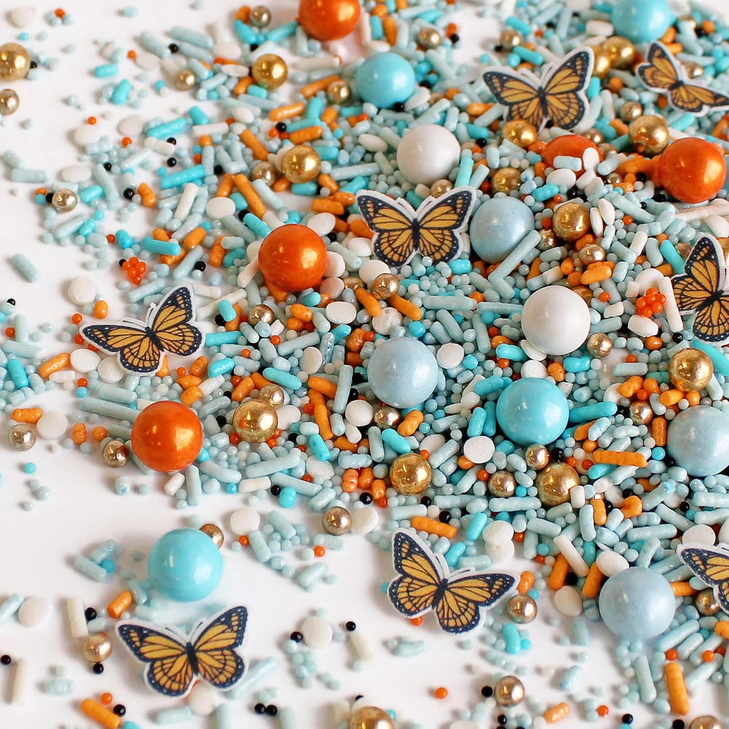 Sprinkle Pop Monarch Butterfly Sprinkle Mix| Blue Orange Sprinkles with ~20 Butterfly Wafer Paper and Gold Dragees| Decorating Sprinkles Made In USA for Mother’s Day Cupcakes Cakes Cookies Donuts, 4oz