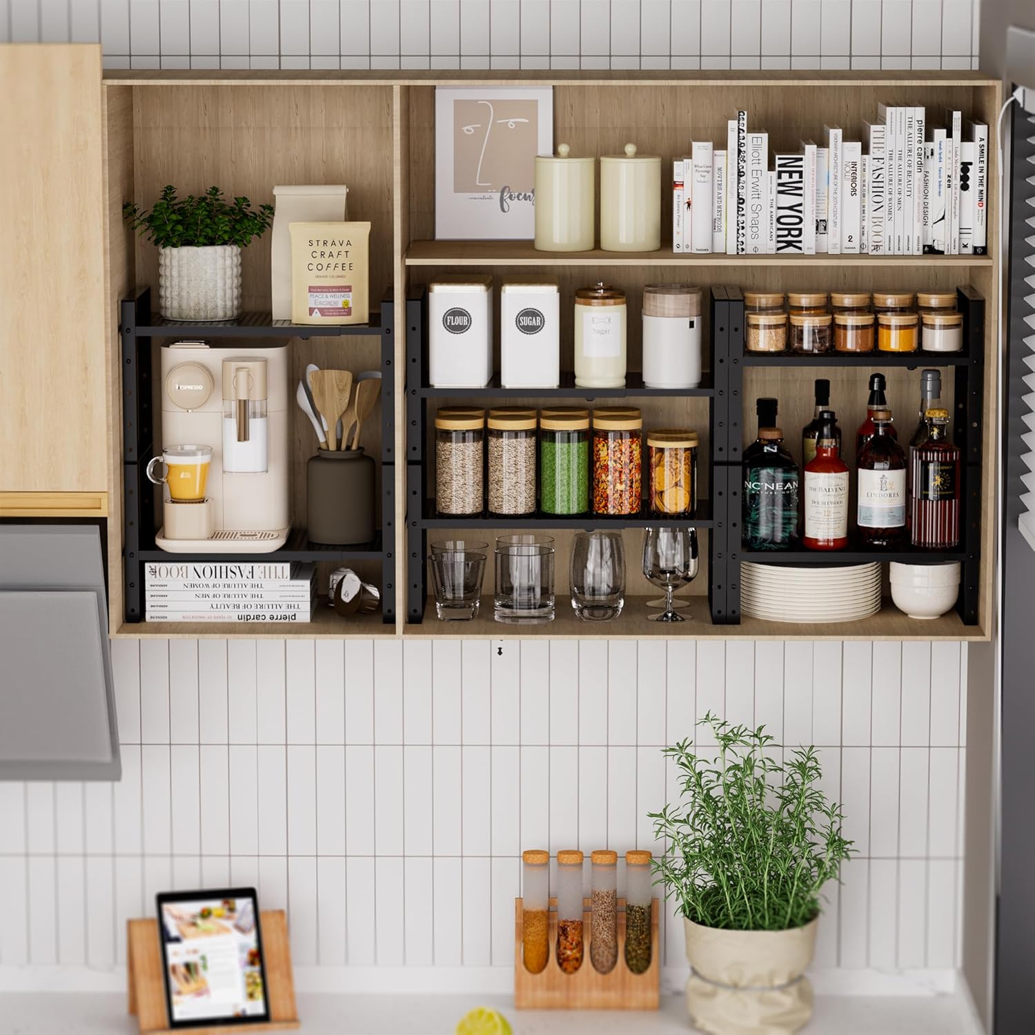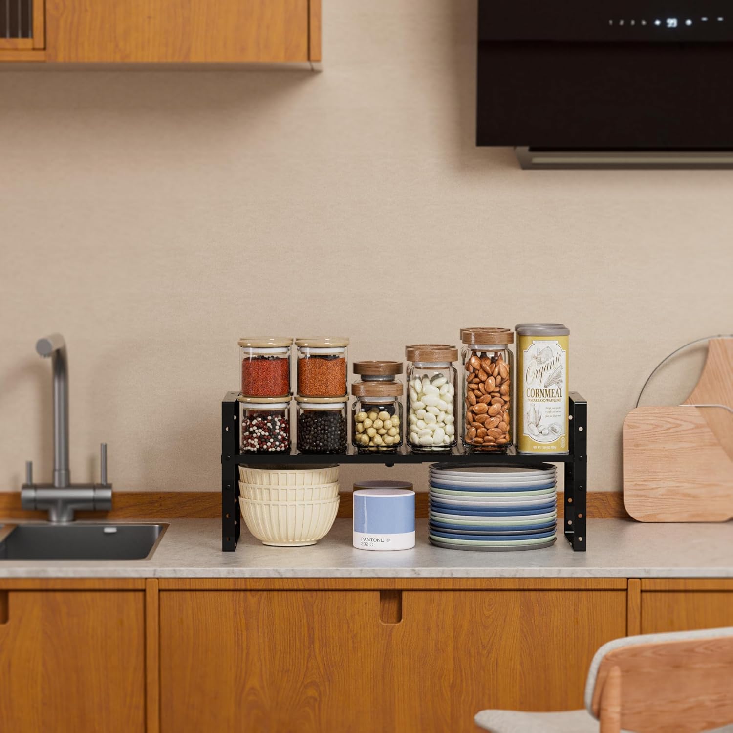 - ⭐【Versatile Spice Shelf for Cabinet】This adjustable kitchen counter stand shelf instantly create additional storage space.It is very helpful to organize the Bottles, Cans, Bowls, Plates, Pans, Soup pots in kitchen,Pantry and cupboard.Also a great space-saving option for the bedroom, study, sitting room, bathroom, and more.In particular, our larger sizes can be used as shoe racks alone.