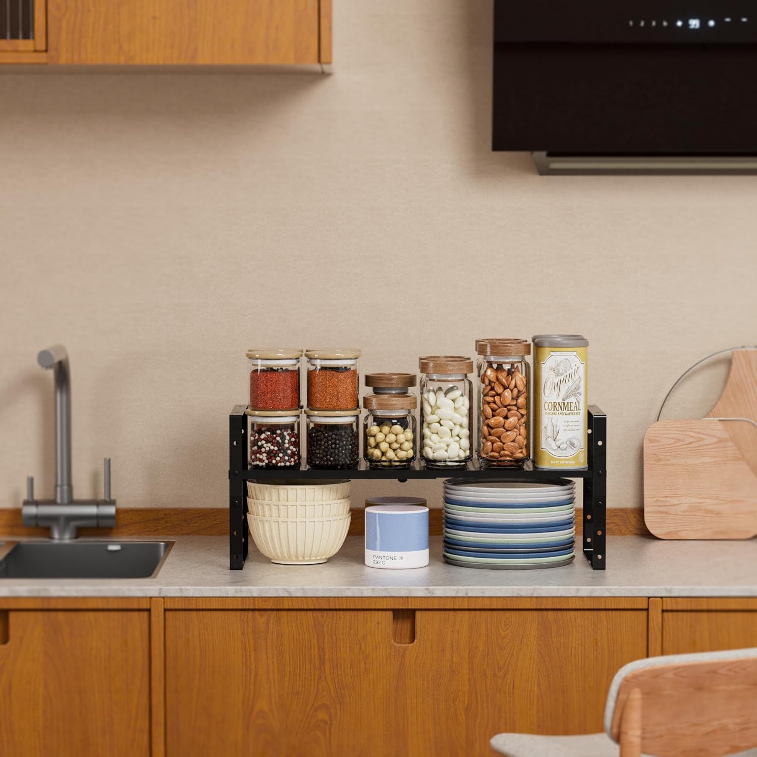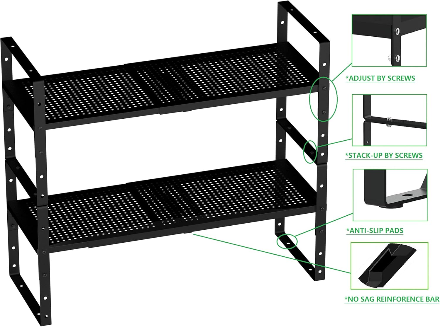 Expandable Shoe Rack Stackable Metal Pantry Storage Shelves Stand Adjustable Height Cabinet Shelf Organizer Racks Spice Shelving(1PACK/BLACK,LARGE)