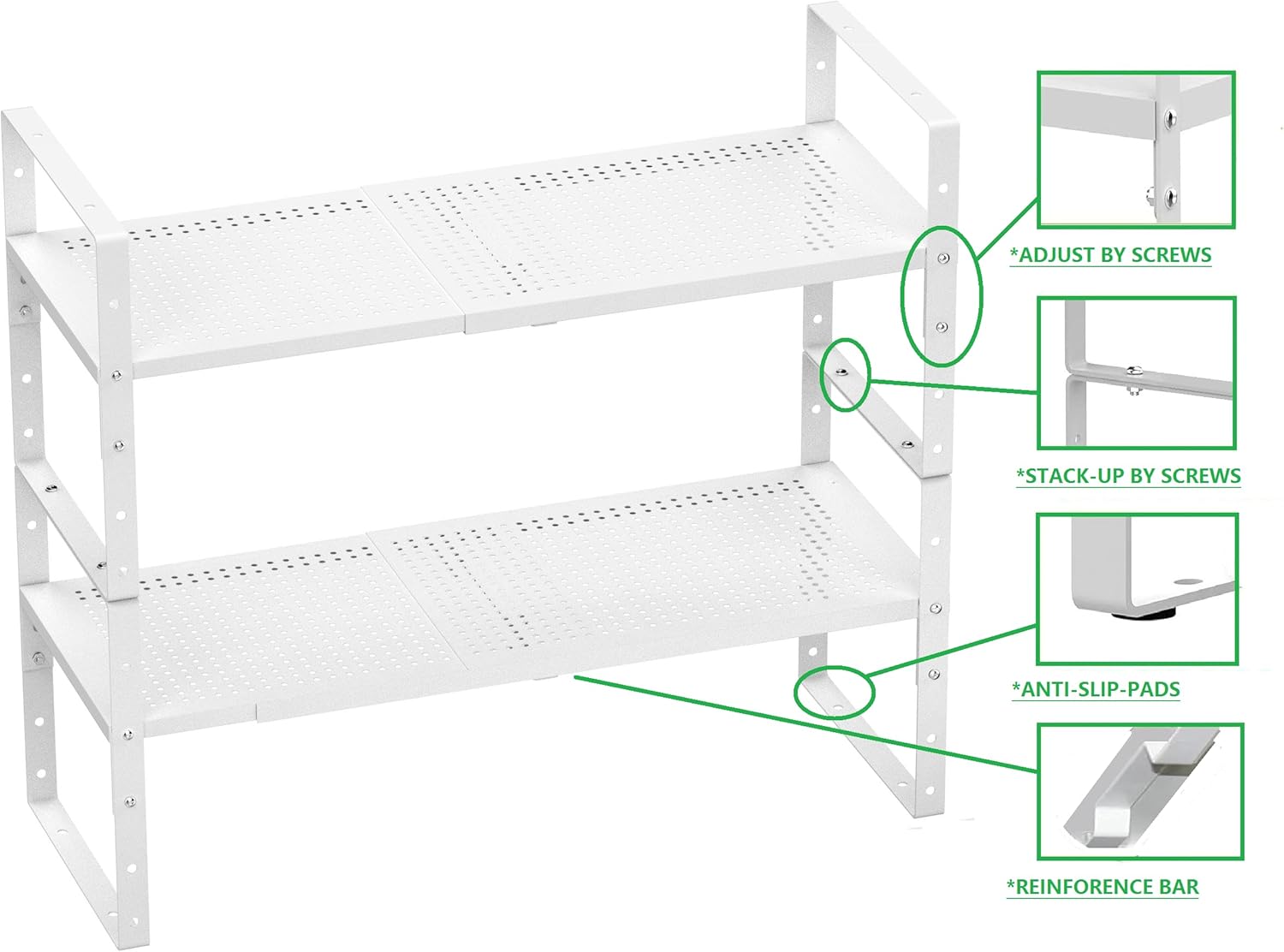 - ⭐【Expandable & Stackable Cabinet Organizer】This cabinet shelf is expandable, allowing you to adjust the width and height to suit your needs.The measures are 8.11"Dx16.54~27.17"Wx2.17~7.88"H.There are 5holes for each side which can be adjusted the width from 16.54" to 27.17".It also can be easily stacked up to a 2 or 3 tier kitchen organizer.