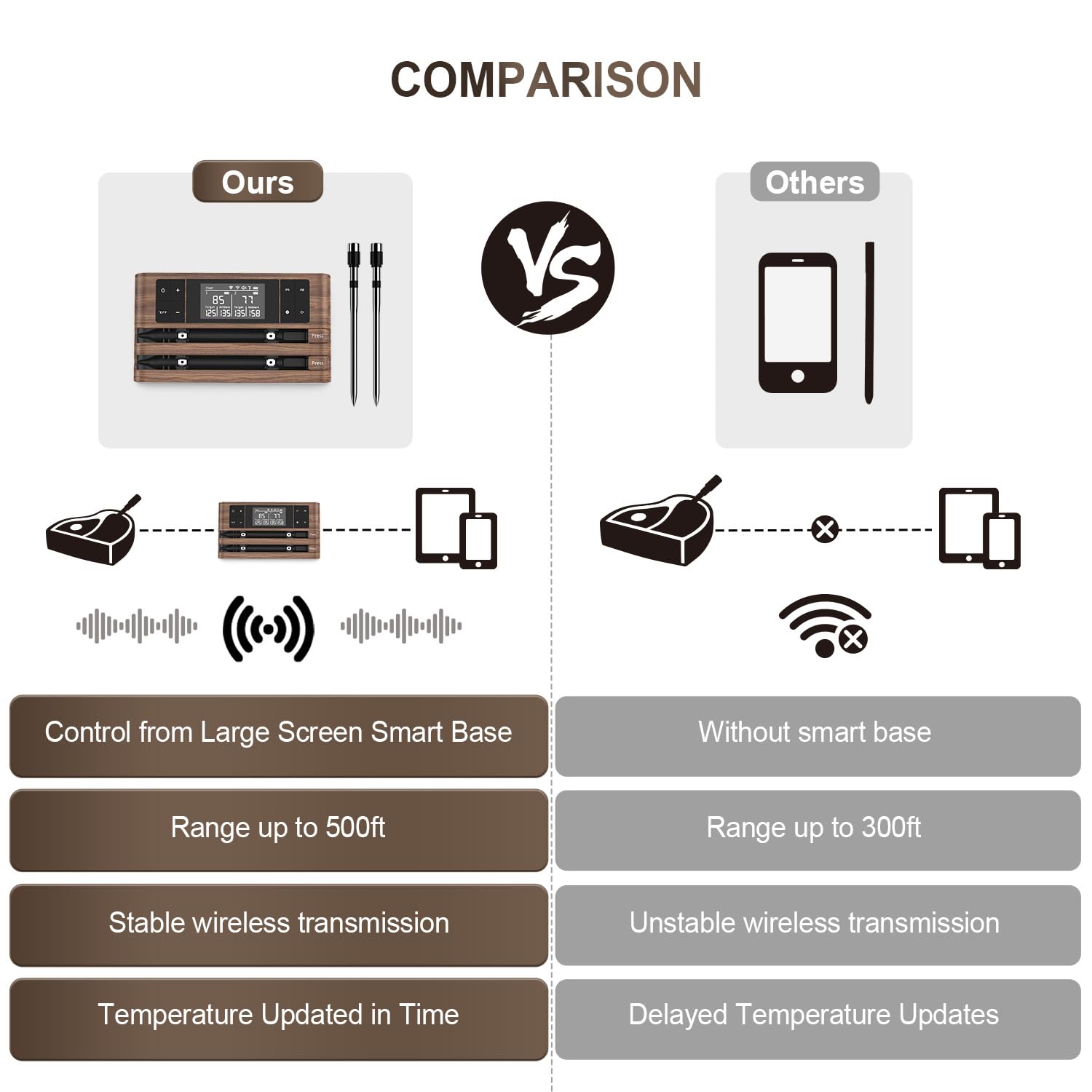 - 500FT Long-Distance Signal Transmission: The dedicated app connects wirelessly to the main unit, which acts as a signal relay between the probe and the app. This ensures a transmission range of up to 500FT, so you can monitor your cooking progress from the kitchen or backyard.