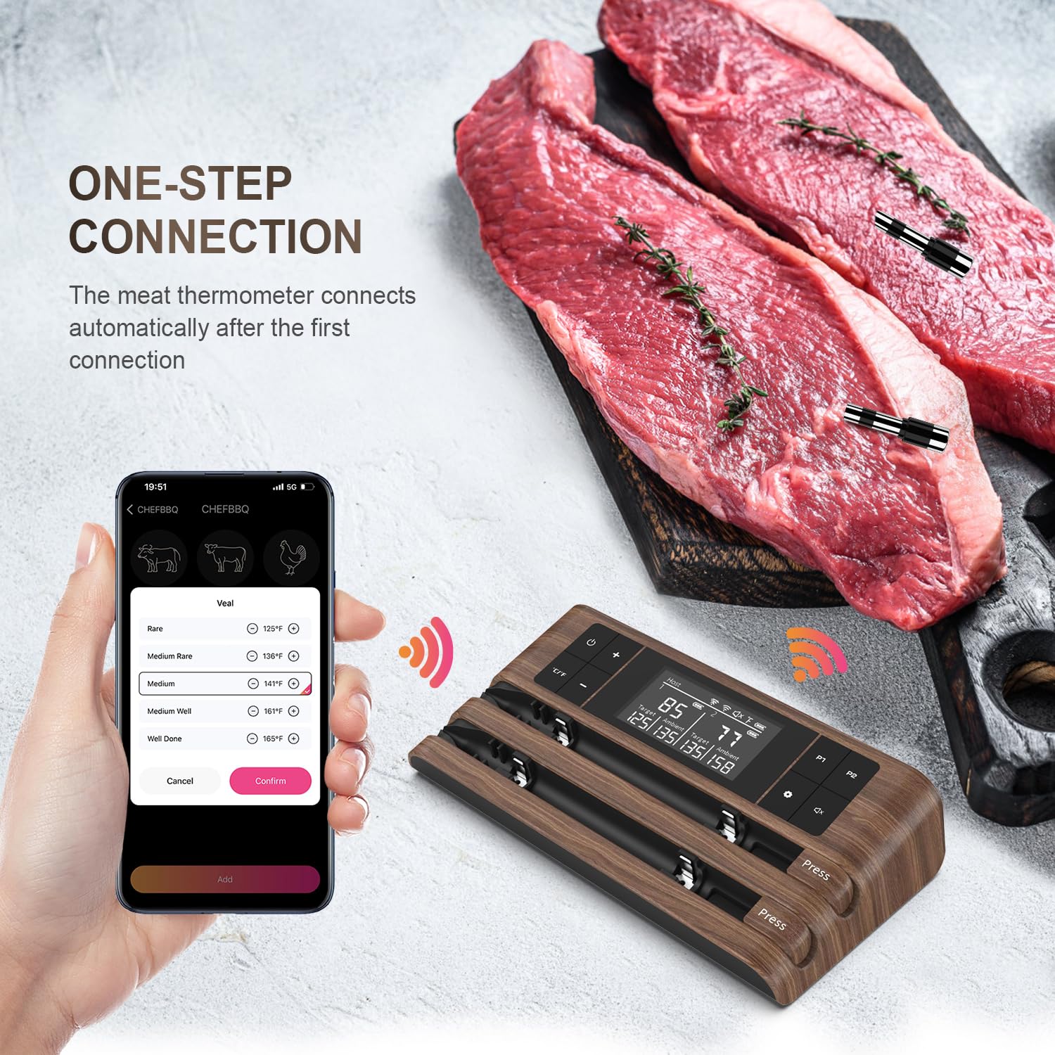 - Smart App with One-Touch Settings: The app syncs with the main unit in real time and offers preset temperature suggestions for different meats and doneness levels. Its user-friendly interface with graphical views makes it simple to adjust settings with just one click.