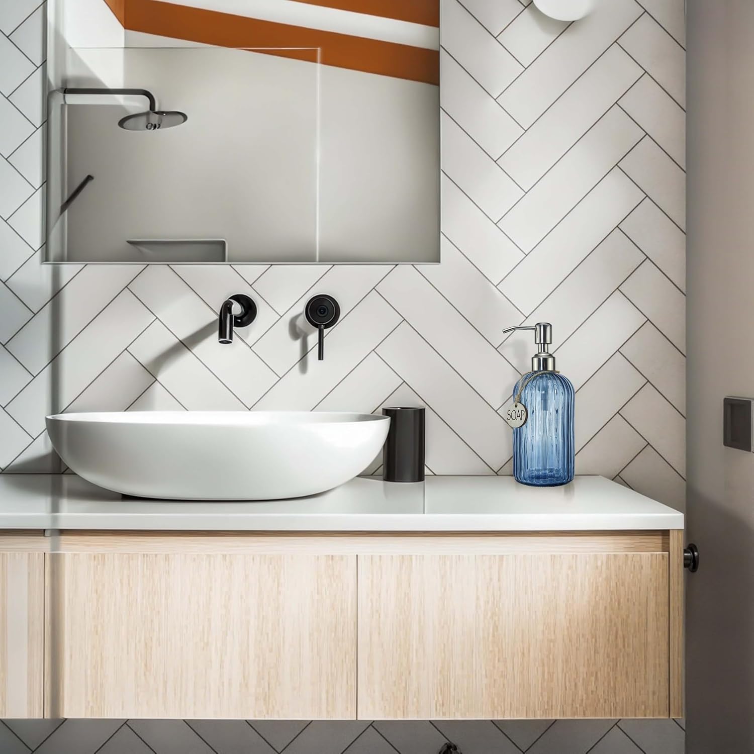- ATTRACTIVE BATHROOM ACCESSORIES: Stylish Bathroom Soap Dispenser Featuring Vertical Stripe and Navy Blue in color. Lovely Way to Bring Visual Texture to Your Bathroom or Kitchen Sink.