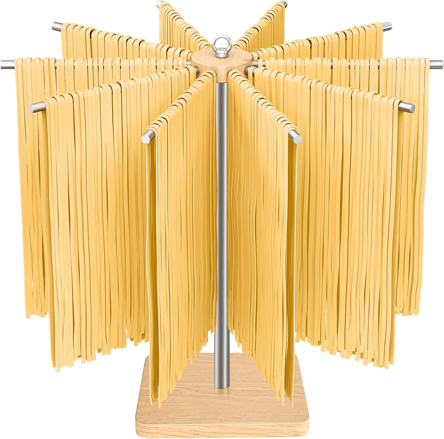 - 【NOTE: The pasta drying rack comes with two different base designs: Square or Round. They will be shipped randomly.】Well Constructed. Made of 304 stainless steel and a thick natural wood base, the pasta drying rack won't tip over easily when trying to load pasta on. Brushed finish keeps pasta from sticking to the bar and is easy to clean.