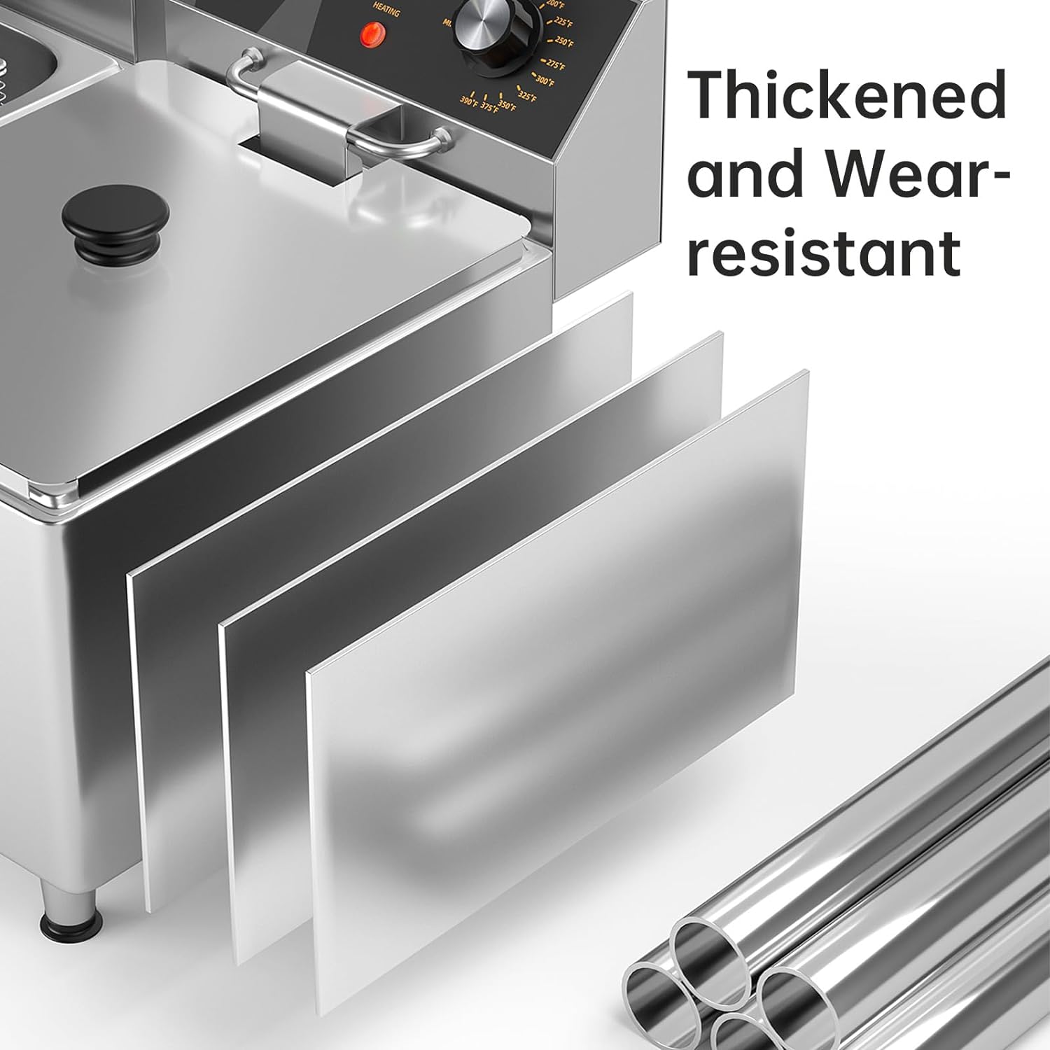 - Soild Stainless Steel Construction: Its durable thickened stainless steel construction makes deep fryer resistant to denting, rusting, and scratches, while also providing simple cleaning. This commercial countertop deep fryers with temperature limiter to avoid overheating and food-grade 304 stainless steel heating element for added safety.The thread of the support leg can be rotated to adjust the height