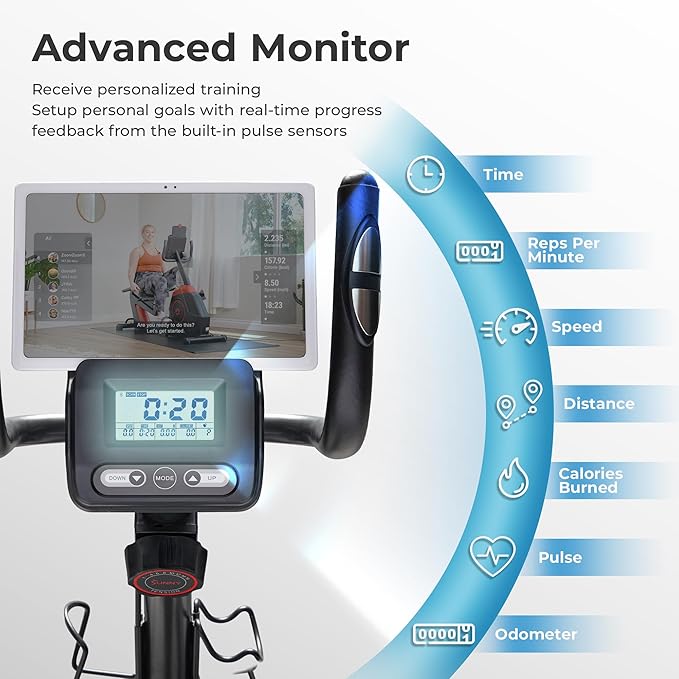 • 【ADVANCED DIGITAL MONITOR】 Personalize your training by setting time, distance, calorie, and heart rate goals. Track progress in real-time with the advanced digital monitor and use the built-in pulse sensor for precise workout metrics.