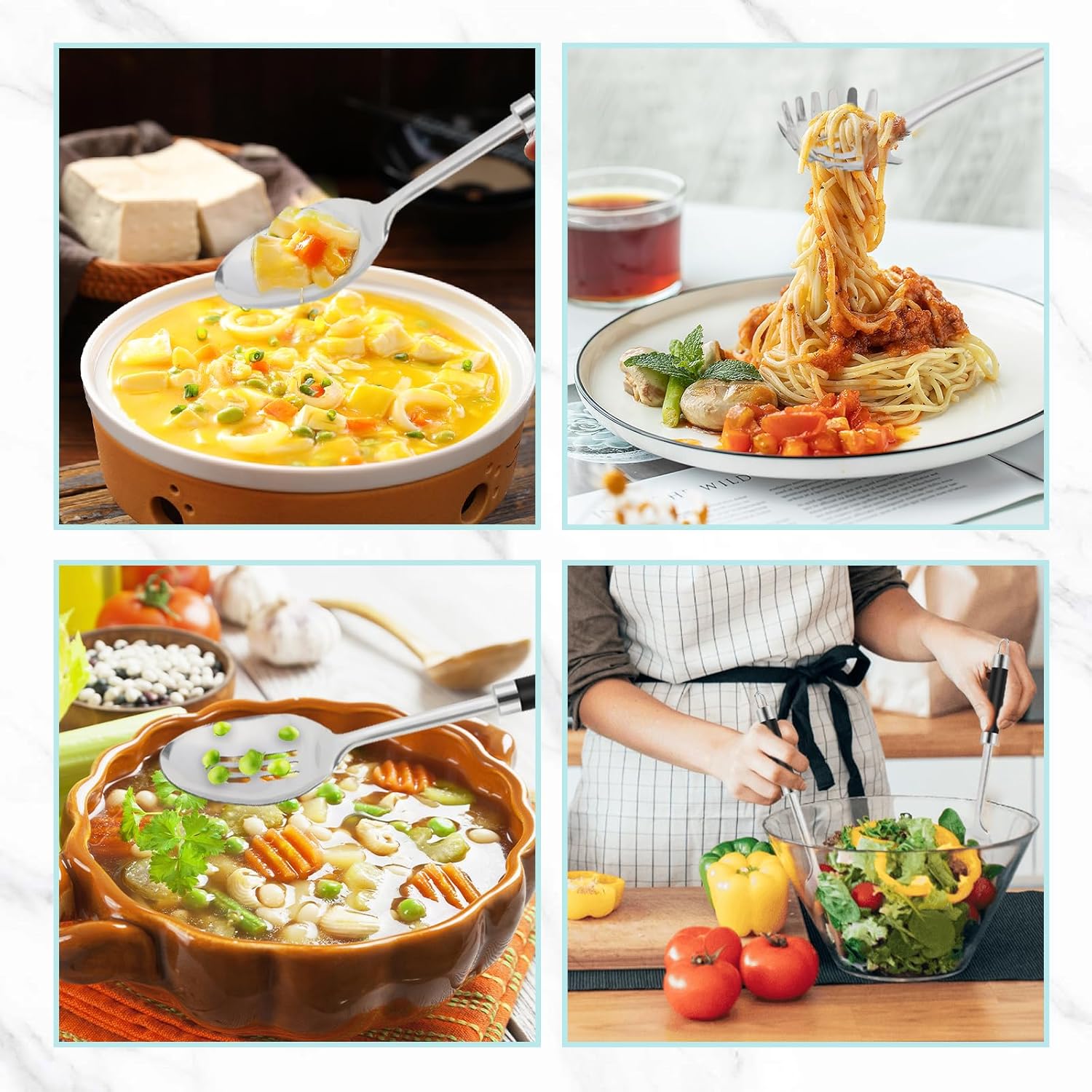 - Multipurpose: Large stainless steel serving spoon, cooking spoon, pasta spoon, slotted spoon, and more, suitable for cooking, serving, stirring, and baking, designed for mixing chicken salad, serving spaghetti or green beans.