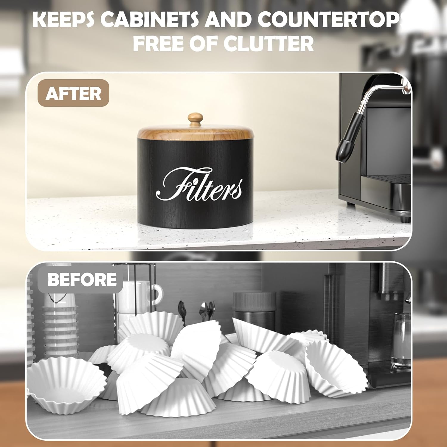 - 【Basket Coffee Filter Container】: Our coffee filter holder with lid is capable of holding various sizes of round basket-shaped pleated filters commonly found in the market, a sizeable internal capacity is enough to store your daily coffee filters, it is a perfect addition to your coffee bar decor