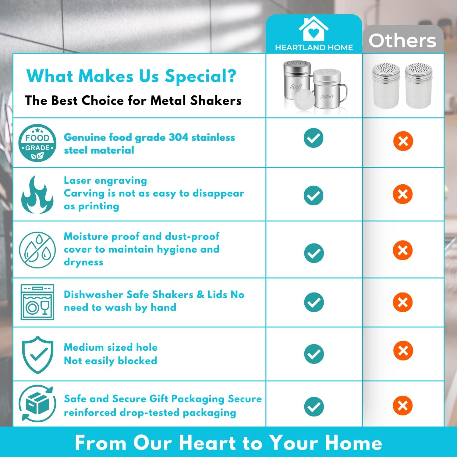 - EASY-TO-DISTINGUISH DESIG: 2 pieces of stainless steel salt and pepper shakers with lids and handles, and engraved with different words . The salt shaker is marked with "salt" and the pepper shaker is marked with "pepper", bringing more convenience to your kitchen