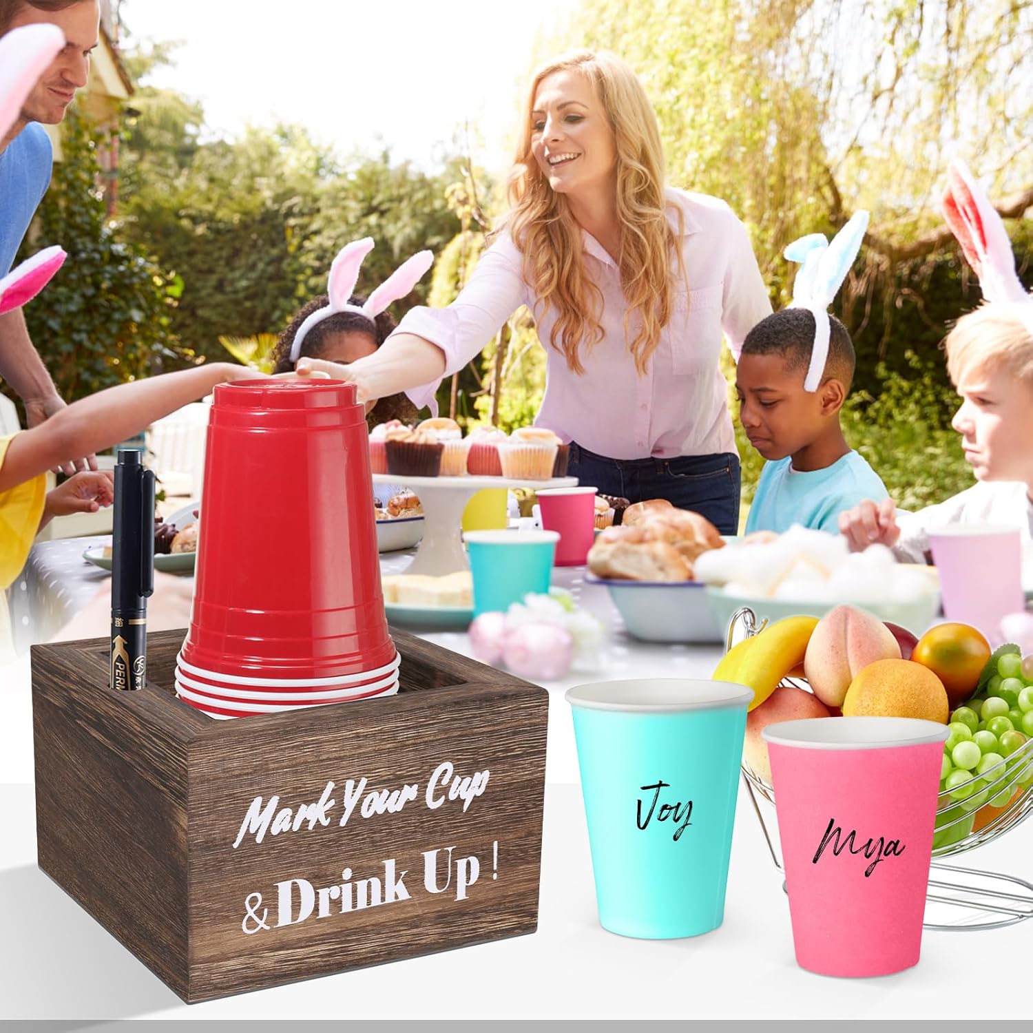- 【Perfect Size For Party Cups】This wooden cup holder can accommodate most party cup sizes, including cups ranging in size from 10, 12, 16, and 18 ounces! Package included-You will receive a wooden white cup holder with a marker slot, printed with words-Mark Your Cup & Drink Up. And one marker pen. Use our party cup holder for the perfect addition to any party!