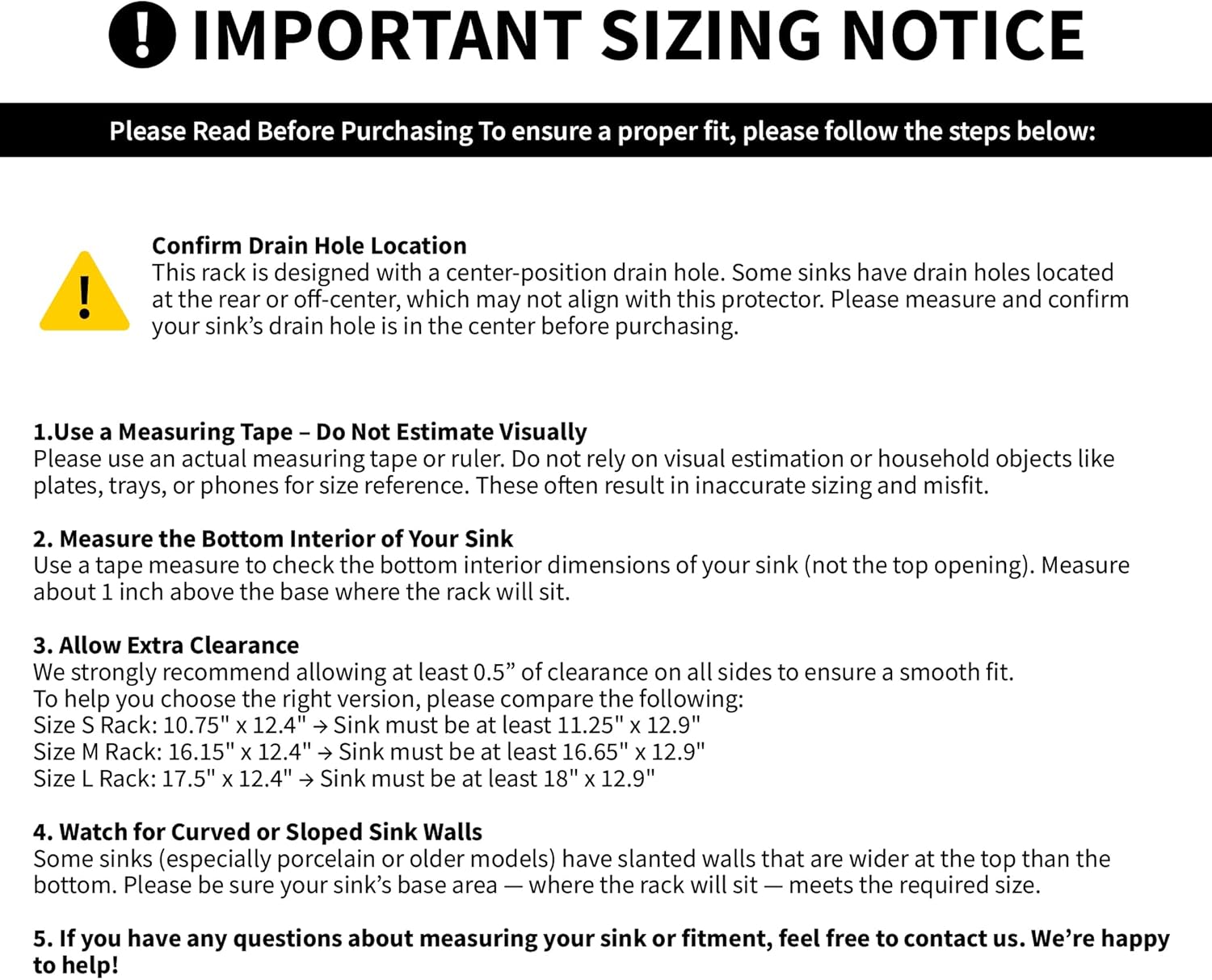 - ⚠️ Check Sink Shape – Ensure the base of your sink (not the top opening) meets the required size. For sinks with sloped or curved walls, confirm that the bottom interior area allows proper placement.