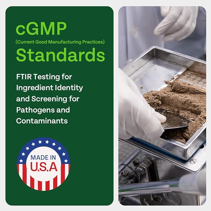 • Made in USA: We follow cGMP (Current Good Manufacturing Practices) standards and conduct assay testing to verify the potency of raw materials, FTIR testing for ingredient identity, and screening for pathogens and contaminants.