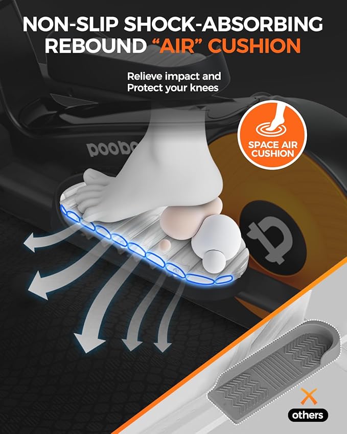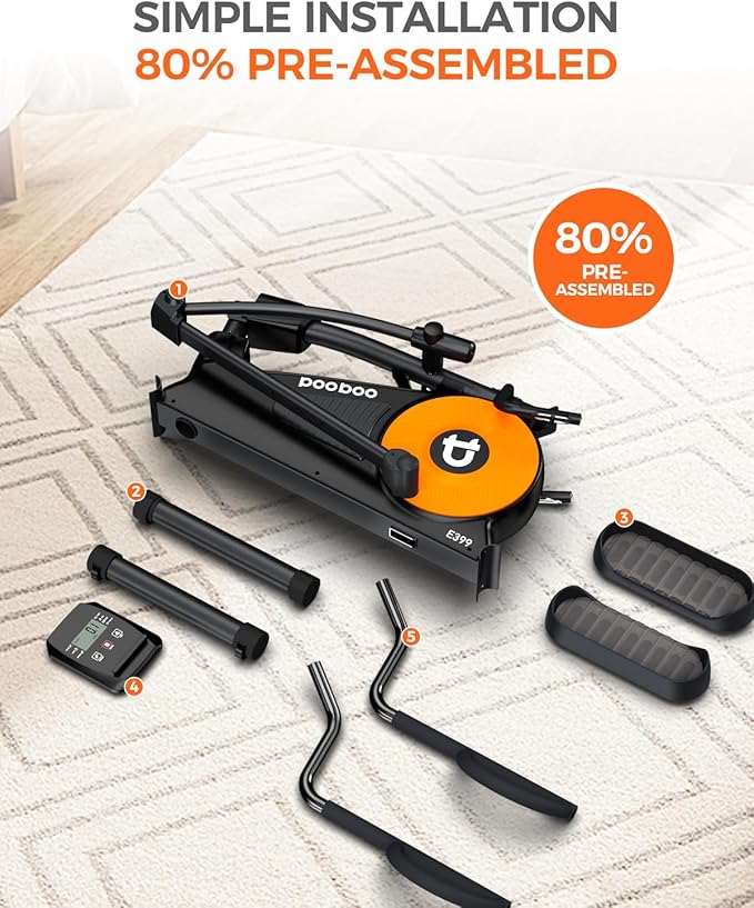 • Warm Tips: The pooboo elliptical machine designed 80% pre-assembled. Say goodbye to the traditional complicated setup process. Guided by the manual or assembly video, you can easily finish it within 30 minutes. Besides, when not in use, it can be quickly and easily folded up
