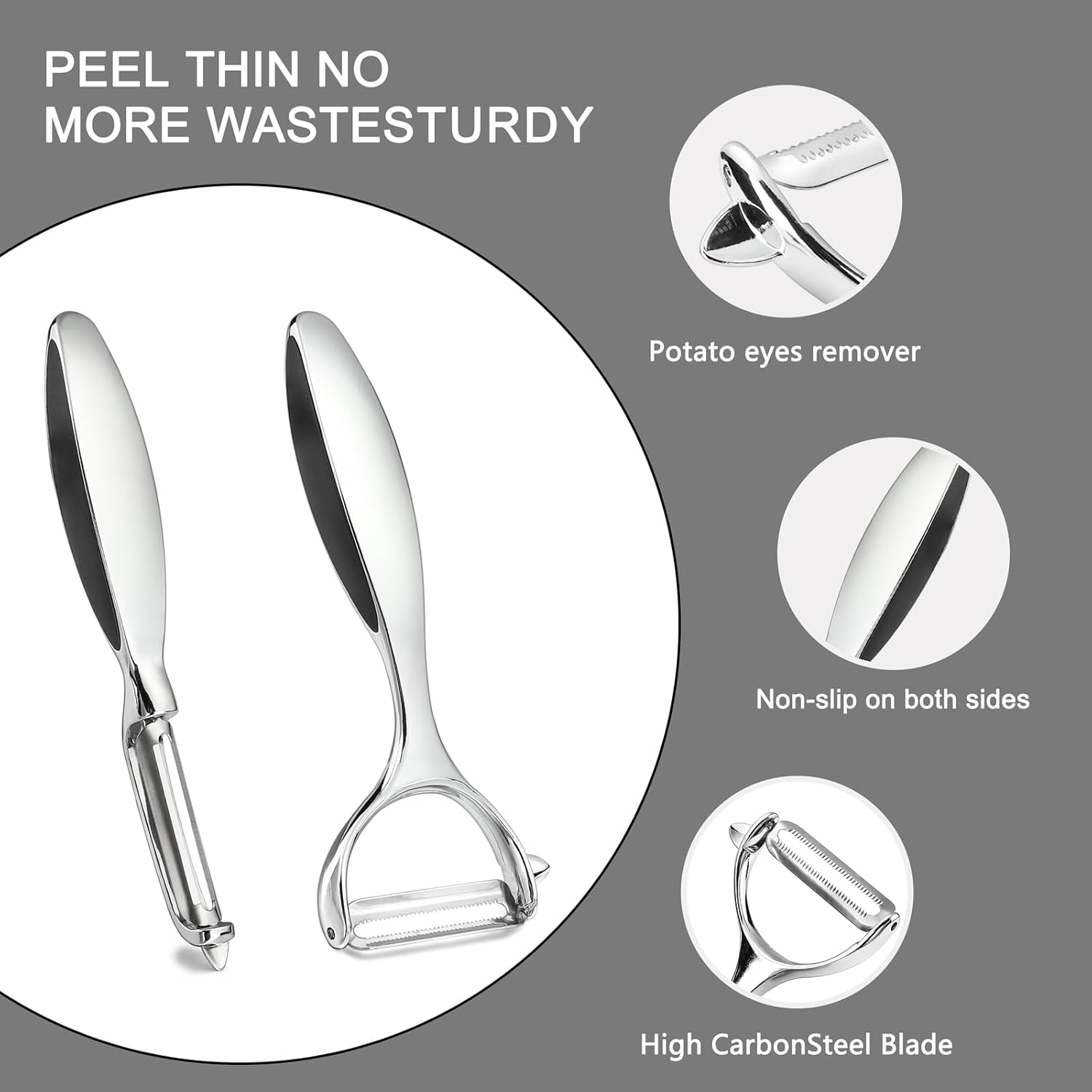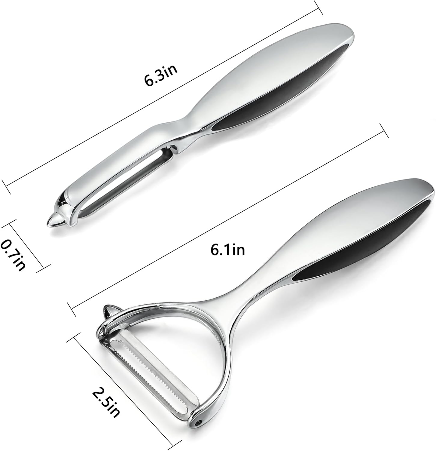 - Peeler Set Content: The potato peeler set includes two shapes of peelers, Y-peeler and I-peeler. Suitable for vegetables, potatoes, carrots, apples, peaches, kiwis, cucumbers, zucchini and onions.