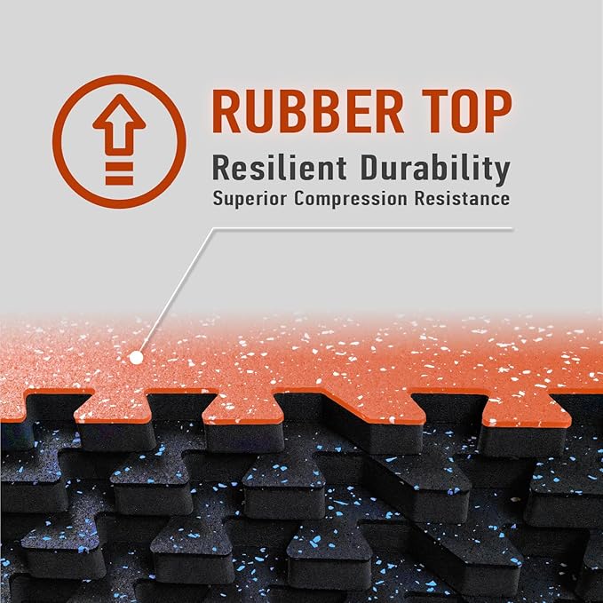 • [Upgraded Dual-Layer Design]: Concerned about your equipment scratching the floor during workouts? Our 2in1 Rubber Top EVA Foam Exercise Gym Mats are crafted to solve this issue. The textured rubber top layer, combined with a high-density EVA foam bottom layer, seamlessly creates a non-slip tough surface with excellent shock absorption.