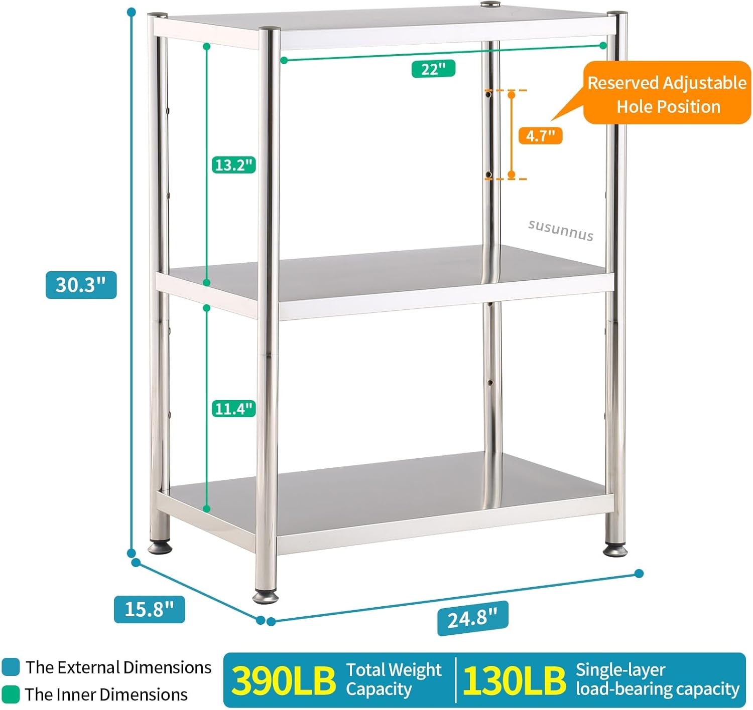 susunnus 3-Tier Stainless Steel Shelf, Heavy Duty Shelving for Kitchen, Garage, Industrial Storage, Kitchen Shelves Adjustable Feet, Easy to Clean(3T-24.8in*15.8in(Without guardrails))