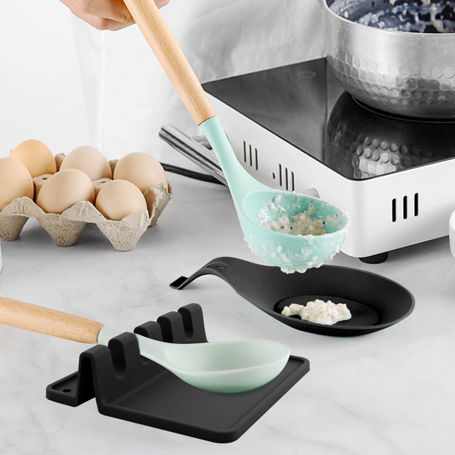 - Keep countertops clean-Our spoon racks have raised edges to catch all the dripping. It prevents oil and sauces from dripping onto the kitchen counter during cooking. This will leave your countertops splash-free and keep your hob and kitchen countertops drip-free and clean. It is an essential cooking tool for any home cook. This square silicone spoon holder will bring you a whole new cooking experience.