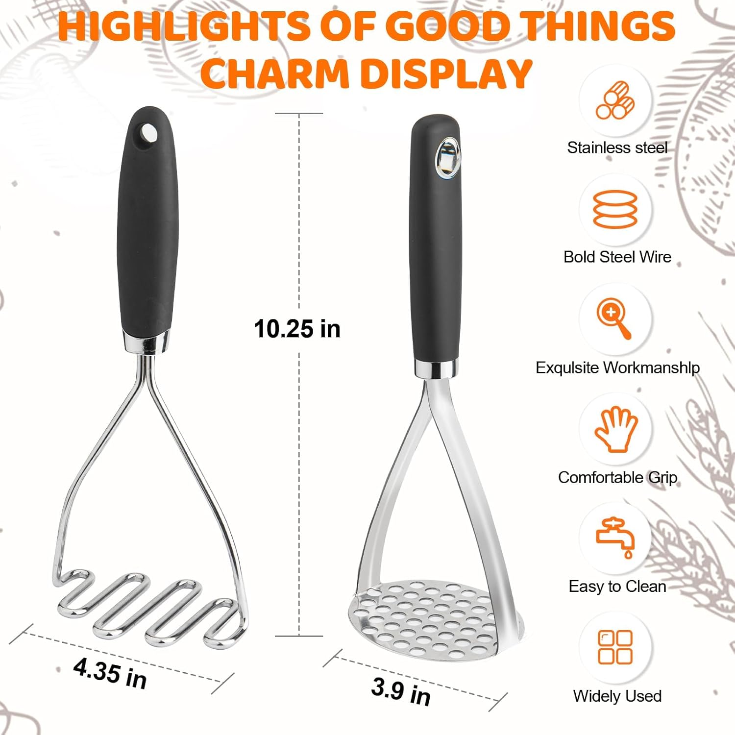 - ★ CHOOSE HIGH-QUALITY MATERIALS: 5mm food grade high-quality stainless steel wire is used to make the head of the potato masher, which is resistant to stains, corrosion, deformation, rust, smoothness, and durability.