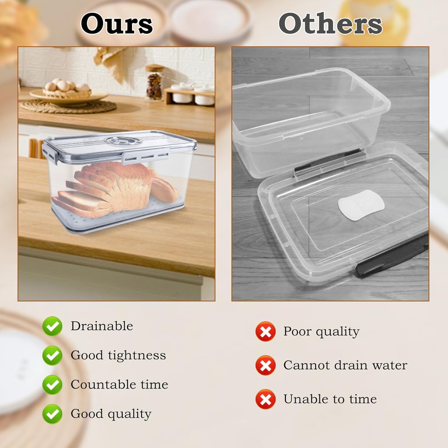 - 🍞 【Detachable Drain Board】: The bread storage container can not only hold bread, but also fruits, vegetables, etc. There is a detachable drainage plate inside the food container, and a porous drainage pad holds the food up, preventing the bottom of the bread box from tightly sticking to the food and preventing it from rotting and spoiling when storing vegetables and fruits in water.