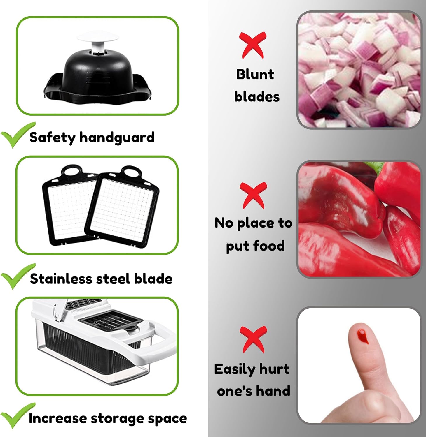 - 🔪【𝟐𝟎𝟐𝟒 𝐔𝐩𝐠𝐫𝐚𝐝𝐞𝐝 𝐒𝐭𝐚𝐢𝐧𝐥𝐞𝐬𝐬 𝐒𝐭𝐞𝐞𝐥 𝐁𝐥𝐚𝐝𝐞】- Our chopper vegetable cutter is equipped with 13 high-quality,stainless steel blades that are durable and rust-resistant. These blades cater to various cutting needs, from precise slicing to consistent dicing, and even julienne cuts. Including 2 spiralizer inserts turns your favorite vegetables into healthy, spaghetti-like strands in seconds, perfect for low-carb diets.