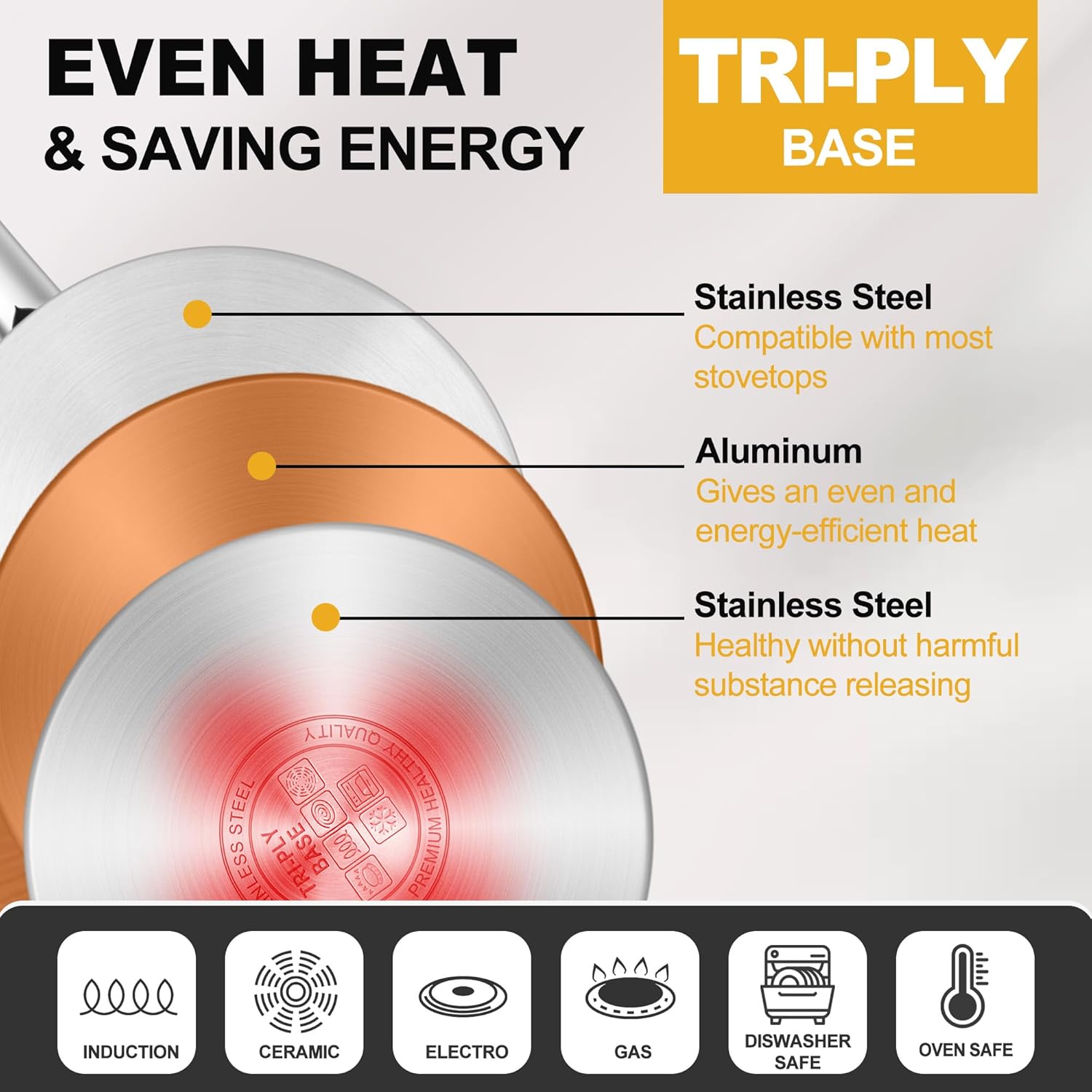 - EVEN HEAT & ENERGY-EFFICIENT - Tri-ply base with one layer of aluminum between two layers of stainless steel, Thickened bottom is durable and stable in shape, Conducts heat quickly and evenly to reduce the risk of food burning and sticking, More energy-efficient thanks to good heat retention, Compatible with most stoves including induction/gas/electric/ceramics cooker