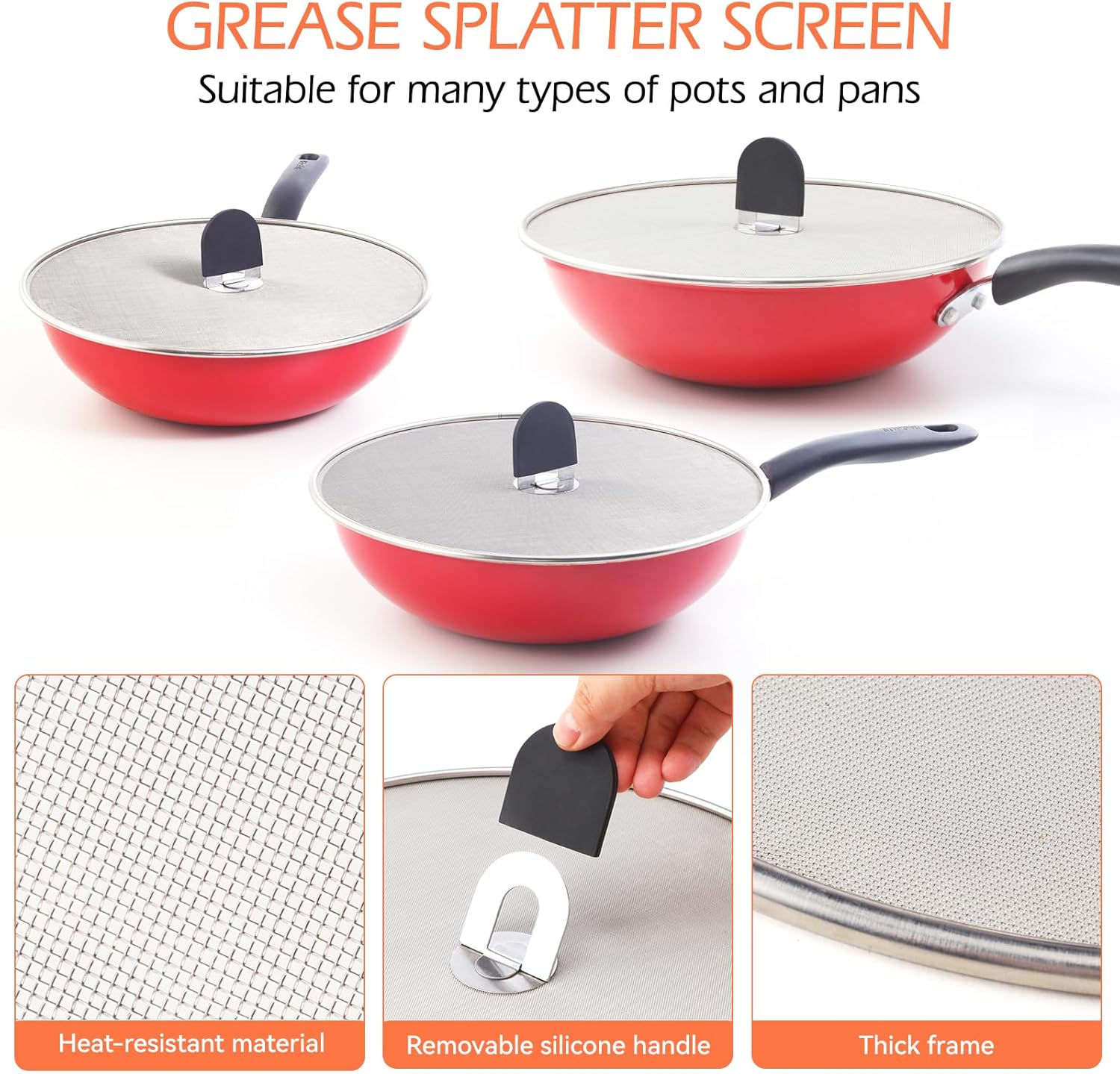 - [Detachable Silicone Handle] - Easy to Detachable silicone handles for protecting you hands keep aways from high temperatures for use our grease splatter guard and keep safety for yourself during cooking or BBQ when use our oil splatter guard