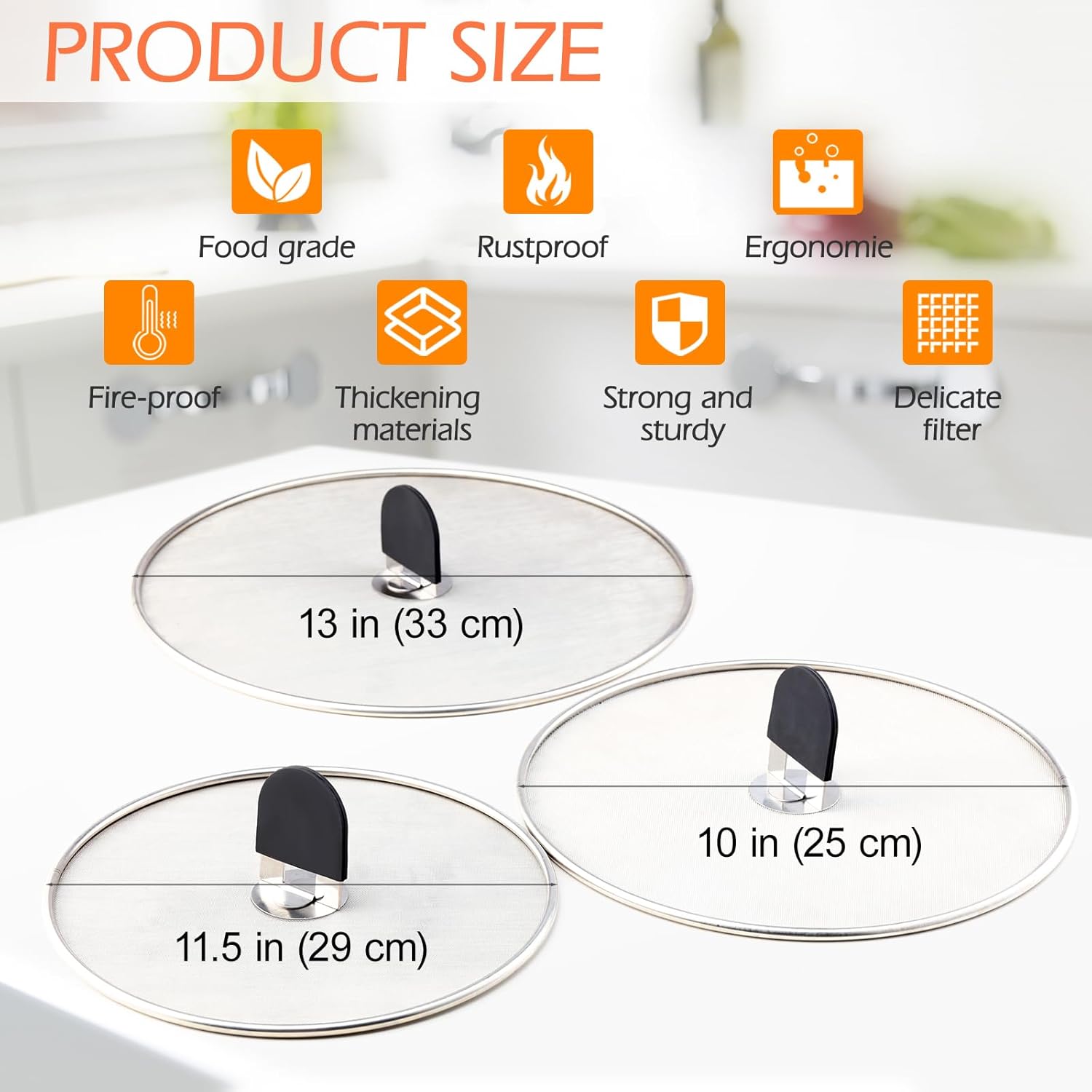 Snowyee Grease Splatter Guard, 3PCS Splatter Screen with Silicone Heat Resistant Handle and Stainless Steel Fine Mesh Design for Safe Indoor and Outdoor Cooking (13/11.5/10 inch and 33/29/25cm)