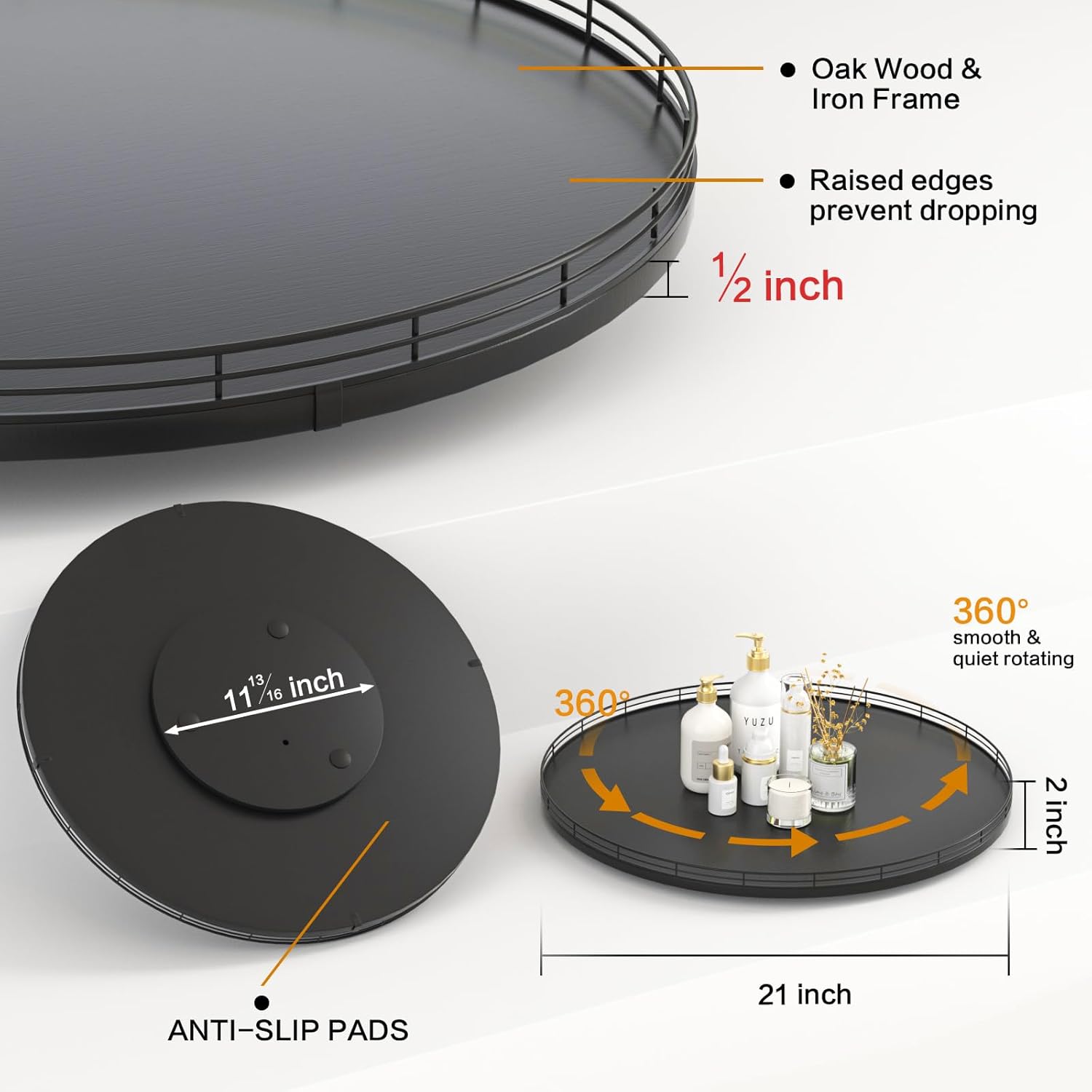 - ๐ง๐ต๐ผ๐๐ด๐ต๐๐ณ๐๐น ๐๐ฒ๐๐ถ๐ด๐ป: The turntable tray features a smooth and silent 360ยฐrotation; Bottom slip-resistant pads for stability and protect your countertop from scratches; Raised edges on each organizer tray to keep items from falling out; Easy to use, no installation required
