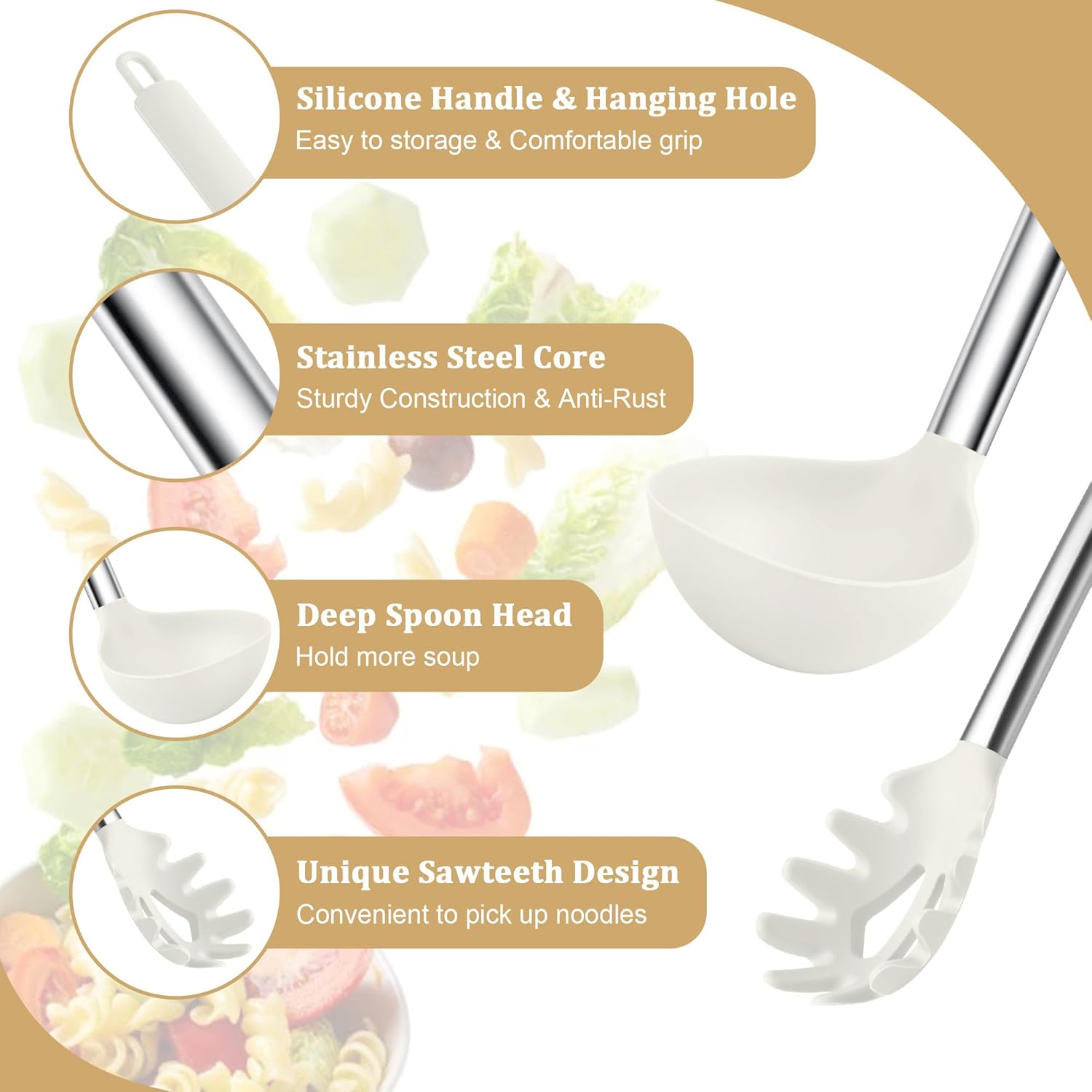 TeamFar Silicone Soup Ladle and Pasta Fork Set, 2 Pcs Large Nonstick Kitchen Cooking Utensils with Stainless Steel Handle for Draining, Serving Soup, Sauce, Spaghetti, Non-Toxic & Heat-Proof, White
