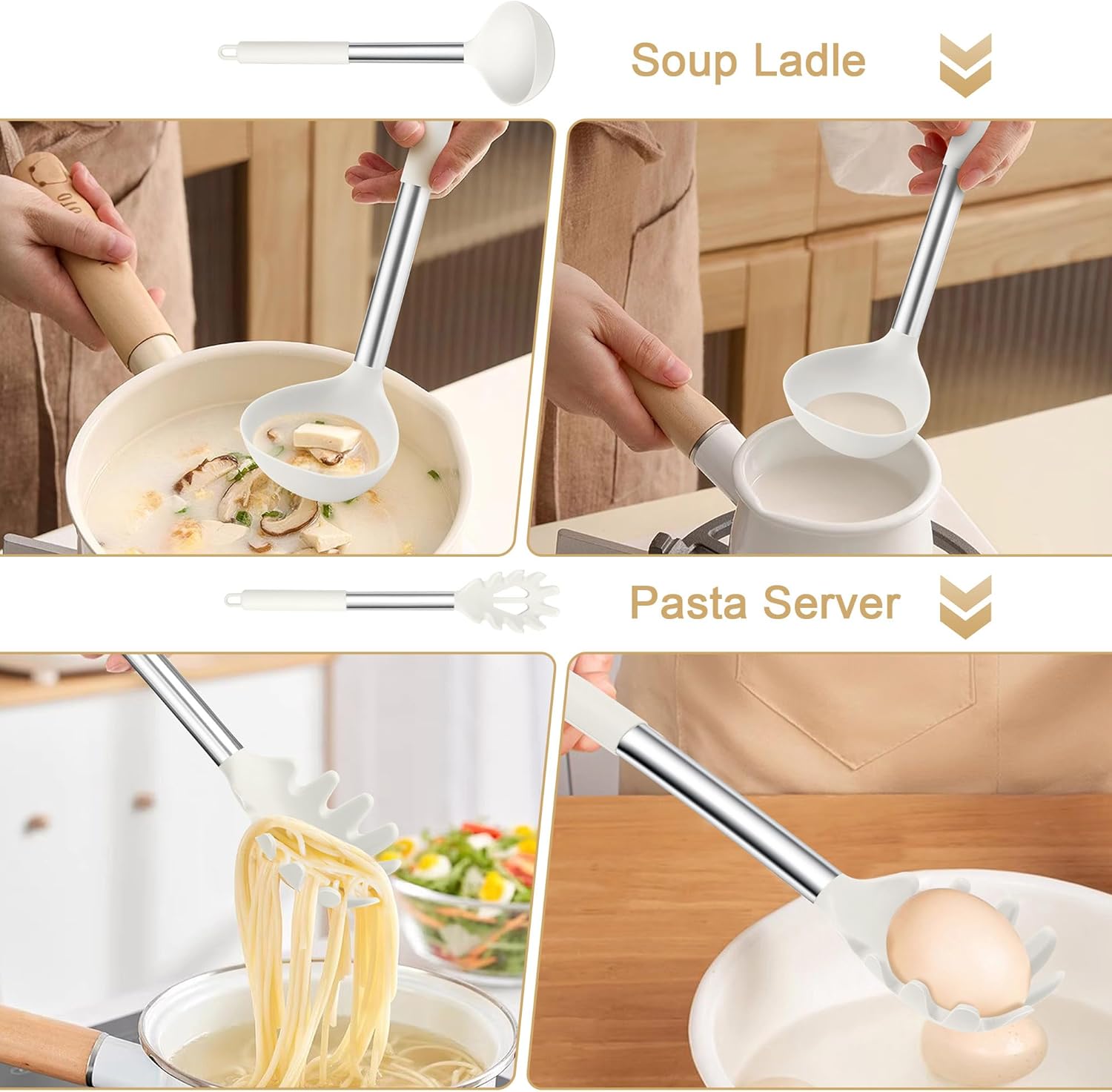 - Thoughtful Designs: The stainless steel handle covered with silicone sleeve for better insulation and non-slip handle is ergonomically for a comfortable grip, Silicone ladle with deep spoon head for serving more food, Pasta fork features a unique sawteeth design and two holes in the middle, Make it easy to drain the hot water and pick up spaghetti with precision