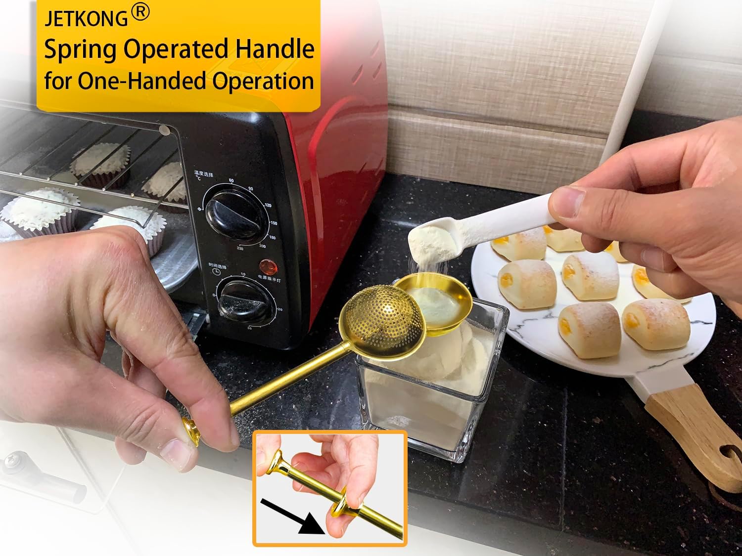 - STURDY AND WELL MADE - JETKONG sugar shaker duster is made of stiff food grade 304 stainless steel, the spring-operated handle and the round sifters welded together and rust-proof.
