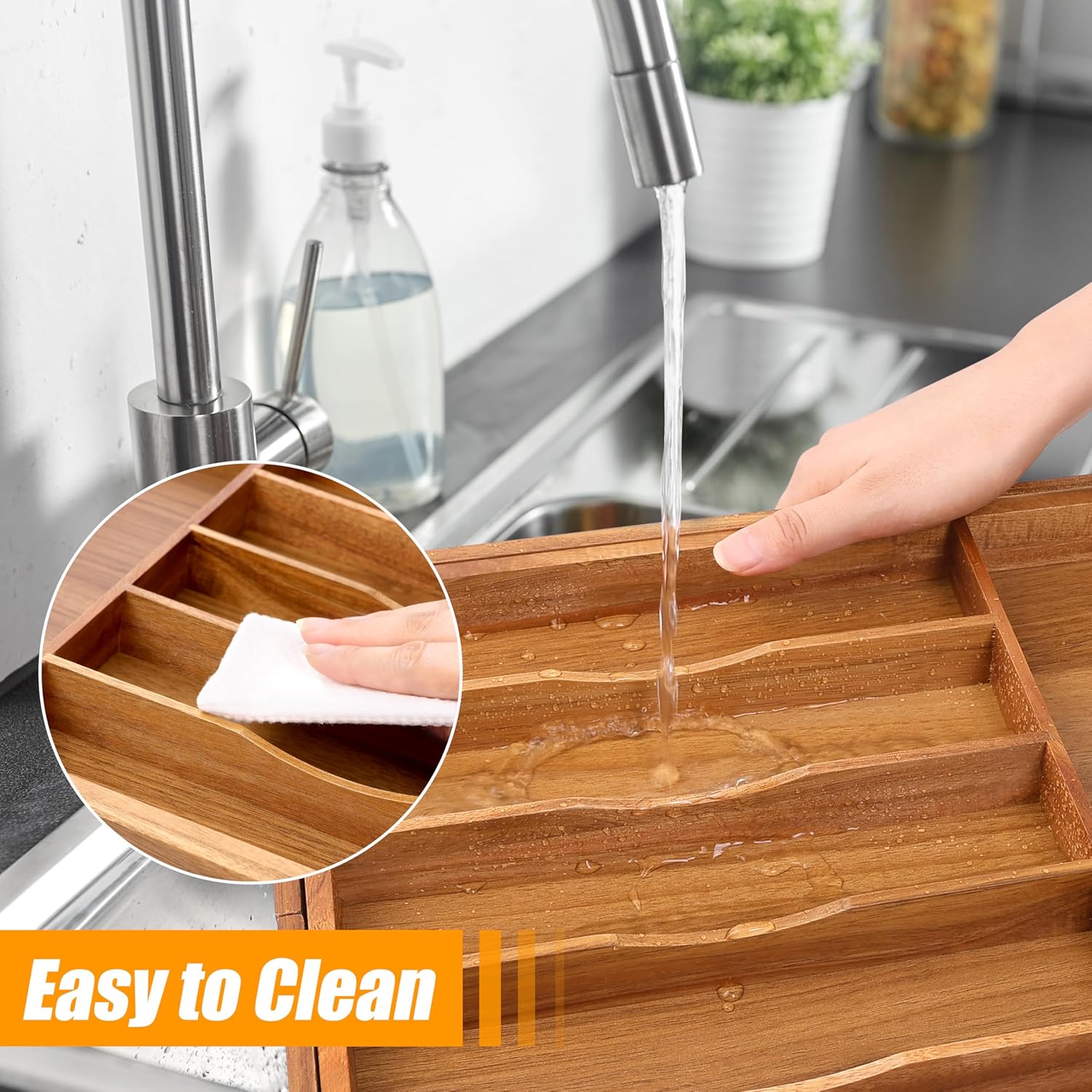 - ✅【Expandable - fit most kitchen drawers.】Our large utensil silverware drawer organizer flatware cutlery tray are adjustable in width, expanding from 17"x13" to 17"x19.6" as needed, with a depth of 1.9" . The utensil silverware drawer organizer is crafted from natural bamboo that has been grown for over 4 years. Each silverware drawer organizer made of bamboo is meticulously handcrafted by seasoned artisans to ensure a smooth, splinter-free surface. You can confidently allow your family or children to use our silverware drawer organizer.