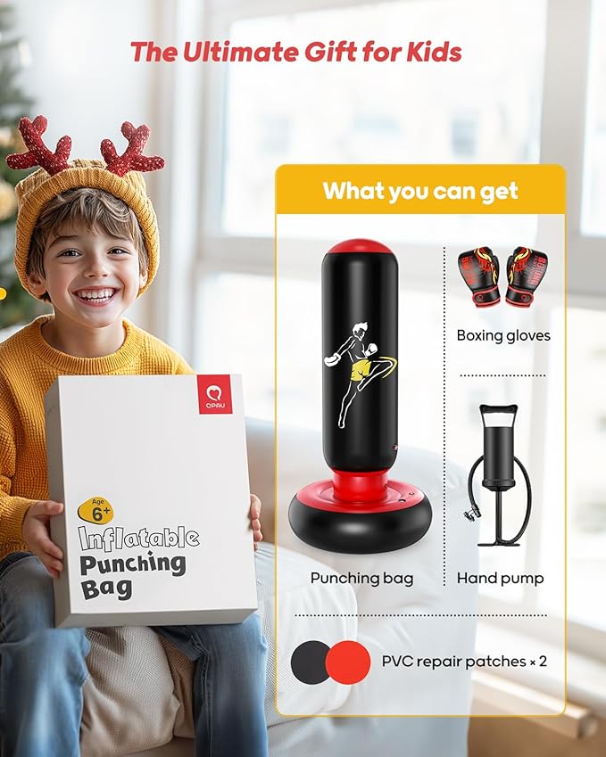 • IDEAL SIZE: The kids punching bag is 66 inches tall after fully inflated. It’s designed for kids 6+ years old and encourages more enjoyable family time. Its bottom base is 31 inches long in diameter, wider than most punching bags on the market, and that provides more stability with weight. The inflatable punching bag helps children strengthen physical fitness and relieve energy while they are at home.