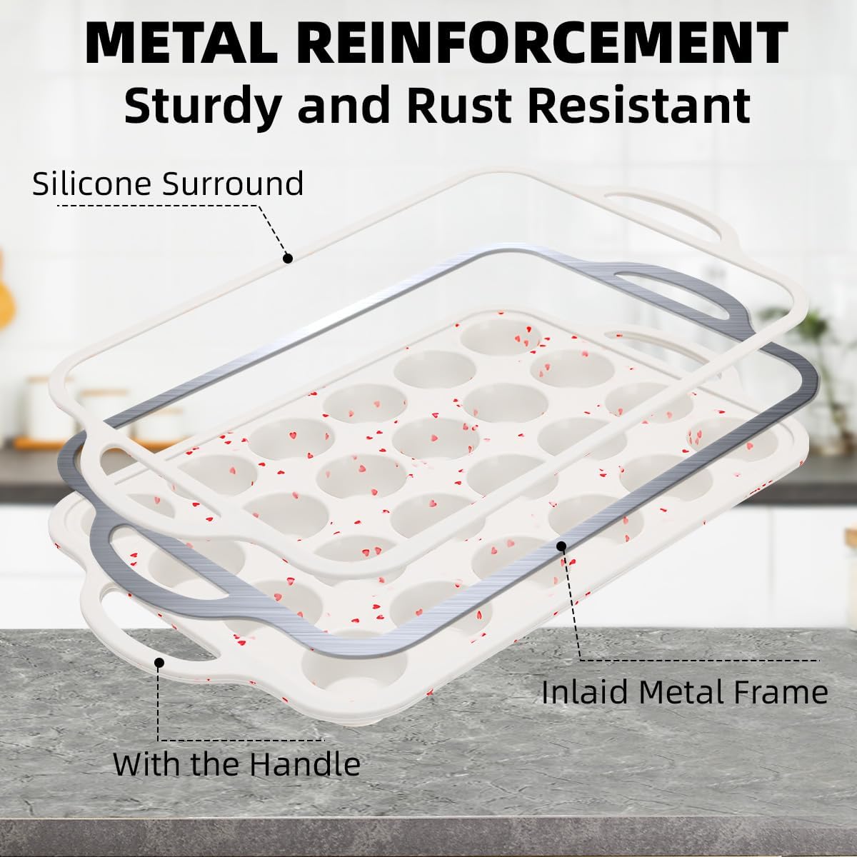 - Metal Structure Silicone Muffin Pan: The hidden stainless steel frame around the outer edge makes silicone muffin pan more sturdy. No more spilling after batter fill in with when transfer silicone mini muffin pan from counter to oven